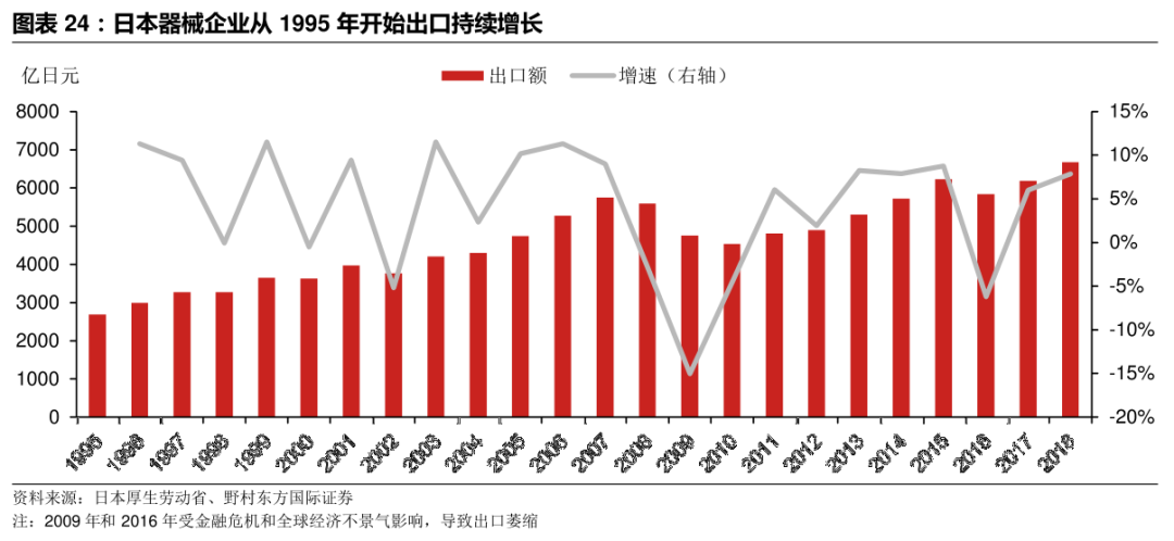 1999-2018年日本器械国内产值的变化和出口数据看,期间出口额从3600亿日元增长到6700亿日元,翻了接近一倍。