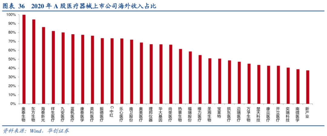 反观国内械企,A股医疗器械上市中,2020年海外业务收入占比超过50%的公司有21家,超过20%的有39家。这其中大部分收入规模也仅仅局限于医疗设备、中低值耗材的出海,而高值耗材则仅在欧洲取得一定市场,最权威的美国市场尚无突破。