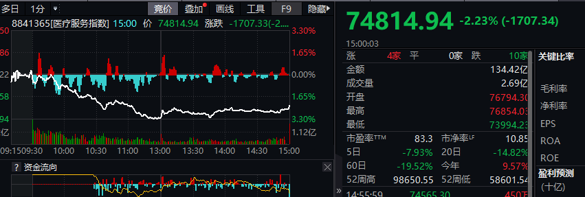 医疗服务板块总市值约1.3万亿。周二,这个板块整体表现较弱,医疗服务指数大跌2.23%。市值超过2200亿的“眼茅”爱尔眼科大幅杀跌,收盘跌幅达8.26%;“牙茅”通策医疗亦大跌5.15%;美迪大跌近10.5%。分析人士认为,大家可能对此次改革试点有预期,所以才会出现提前杀跌的情况。