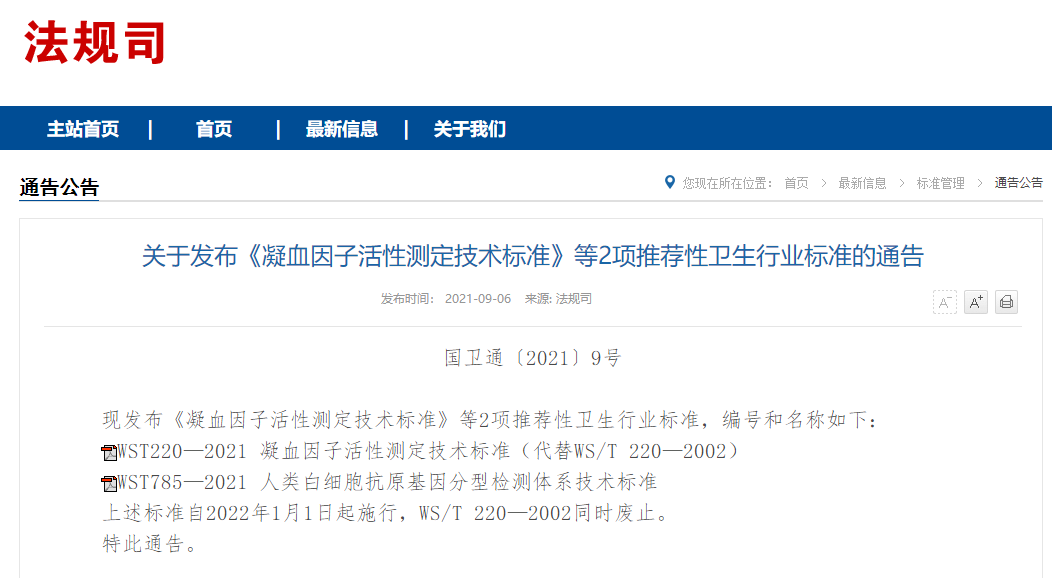 9月6日,国家卫健委发布《凝血因子活性测定技术标准(代替WS/T 220—2002)》《人类白细胞抗原基因分型检测体系技术标准》推荐性卫生行业标准,上述标准自2022年1月1日起施行,WS/T 220—2002同时废止。