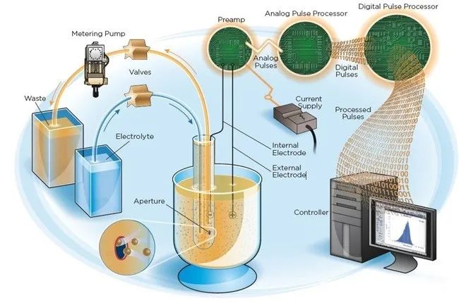 比如众所周知的库尔特电阻抗法(Coulter Principle)。简言之就是,受流体引导的颗粒流过固定孔径的宝石孔,因电阻抗变化而引起脉冲信号,信号大小代表了颗粒粒径(分类),频次代表了数目(数数)。