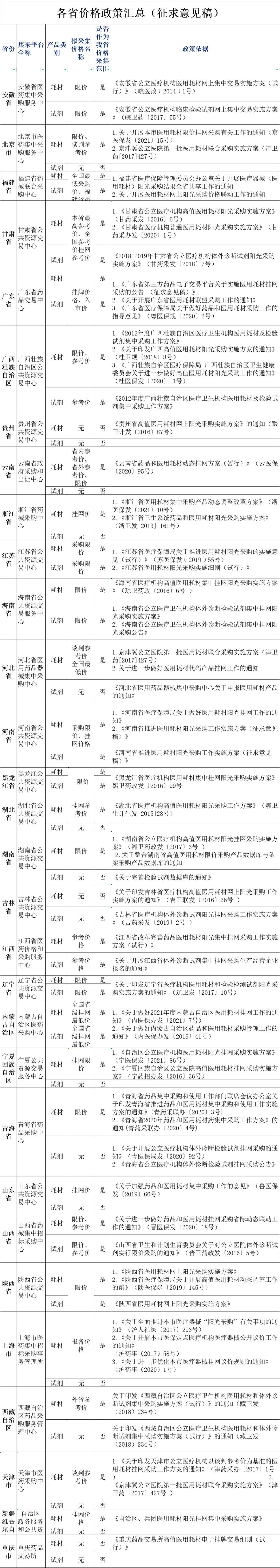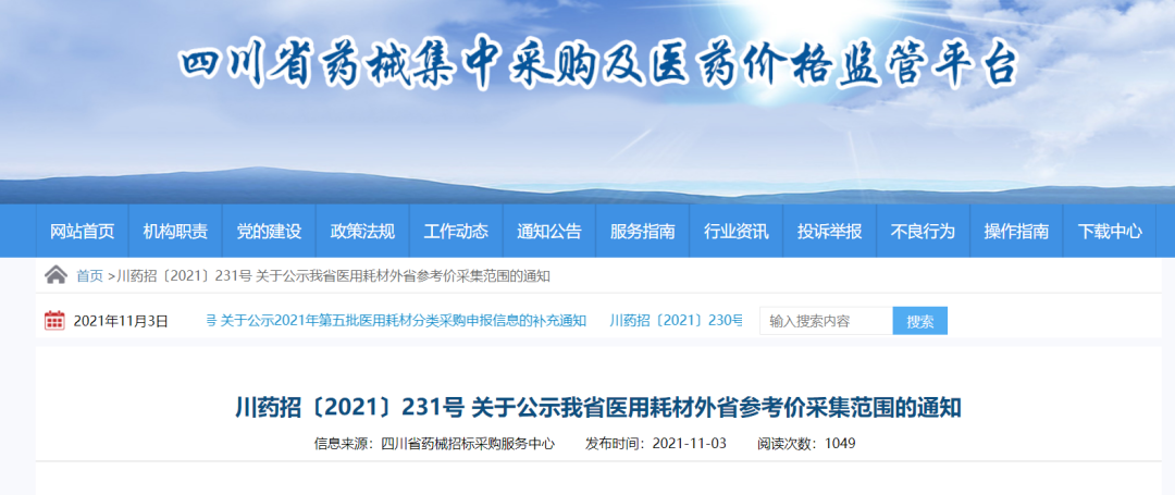 川药招〔2021〕231号 关于公示我省医用耗材外省参考价采集范围的通知 相关医用耗材企业: 根据《四川省医药机构医用耗材集中采购实施方案》(川医保规〔2021〕10号)(以下简称《方案》)及《关于做好医药机构医用耗材集中采购工作的通知》(川药招〔2021〕66号)等文件,省药械招标采购服务中心(以下简称中心)对我省医用耗材(含体外诊断试剂,下同)拟采集的外省参考价及其政策依据进行了收集、汇总,现将相关信息进行公示(见附件1),面向社会公开征集意见并勘误,公示期间无异议的,后续将作为我省医用耗材挂网申报和已挂网医用耗材开展价格整改的重要参考,并作为开展医药企业信用评价的重要依据。现就相关事项通知如下: 一、公示时间 2021年11月3日至2021年12月3日。 二、反馈方式 公示期间,如对公示内容有异议,请相关企业按附件2反馈模板的内容及证明材料(各省政策文件并附系统截图)加盖公司鲜章后以PDF形式发送至sctwzdsj@126.com 邮箱,并同时发送Excel电子版进行反馈。 三、重要提醒 (一)《方案》明确,外省最低参考价是指已在其他省级采购平台公布的最低中标价或挂网价等价格(不包括企业自报价、医疗卫生机构与企业自行议价、国家或省级带量采购中选价格); 各省级采购平台已正式公布中标价或挂网价但尚未发生交易的价格也纳入采集范围:即省级医药耗材招标采购平台挂网正在执行的,医疗机构据此开展议价采购的最高限价。 医药机构与企业自行议价结果不纳入采集范围,但医疗机构的实际采购价若被省级招标采购平台采集为本省的挂网价,则纳入采集范围;各市(州)或市级联盟集采价格若被省级招标采购平台采集为本省的挂网价,则纳入采集范围。 (二)《方案》要求,已挂网产品产生最新外省最低参考价,申报企业须在该价格公布后30天内向中心提交价格信息。 (三)请各相关医药企业参照我省医用耗材(含体外诊断试剂)申报采集外省参考价范围(待正式公布),开展医用耗材申报信息自查纠错工作。凡涉及申报的省级集中采购挂网价或中标价的最低价有误的,请关注中心后续整改通知,并根据通知要求开展整改。 (四)如我省医用耗材外省参考价拟采集范围发布后,有新的外省限价挂网类别产生并符合我省价格联动要求,欢迎各地省级医保部门、药采机构,相关医用耗材企业及时联系中心并提供相应的政策文件依据,中心将在确认后对外省参考价采集范围进行补充完善。 咨询电话:028-85157579 028-86931931 附件:1. 我省医用耗材外省参考价采集范围汇总表(征求意见版).xlsx |