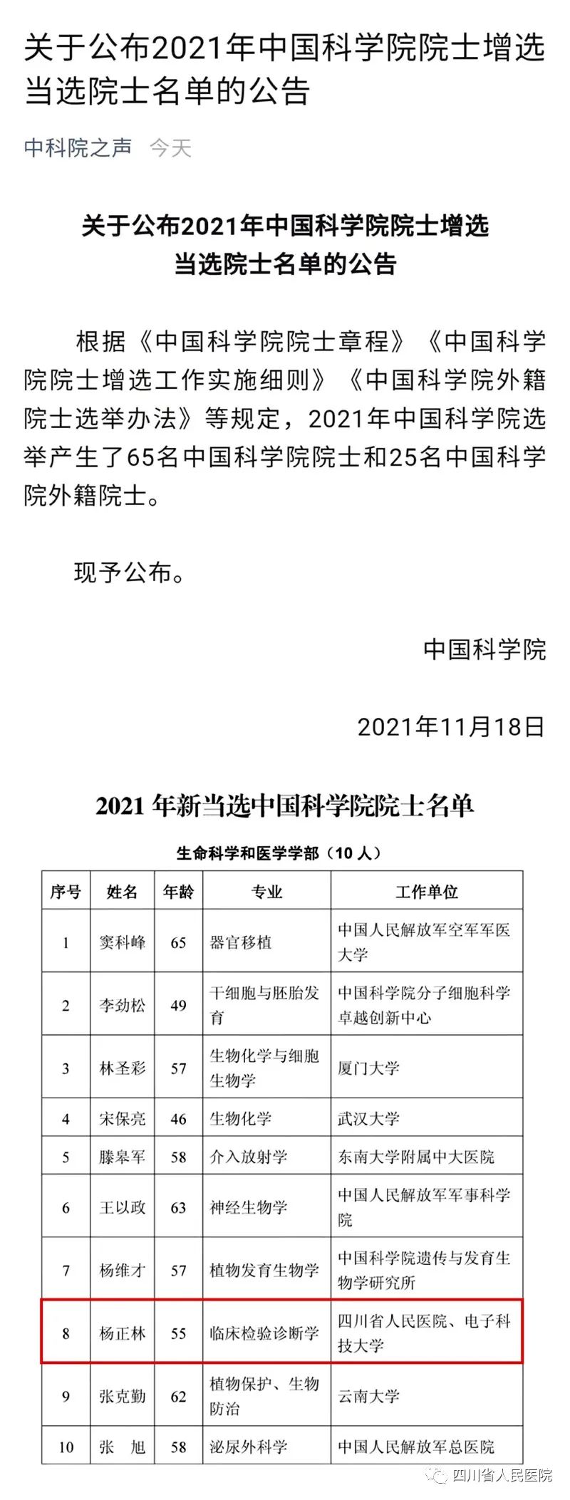 11月18日,中国科学院公布了2021年院士增选结果。四川省人民医院杨正林教授当选为中国科学院生命科学和医学学部院士。杨正林,男,教授,博士生导师,中共党员,1966年6月出生,四川邛崃人。现任四川省医学科学院·四川省人民医院院长、电子科技大学医学院院长。长期致力于临床检验诊断学与医学遗传学的临床和科研工作,带领团队入选国家自然科学基金委创新研究群体、科技部重点领域创新团队、中国医学科学院院外创新单元;立足临床工作的同时,在视网膜疾病致病机制、分子诊断和防治领域取得了系统性和创新性的研究成果,广泛用于疾病的诊断和防治。已在Science、NEJM、Nat Genet、 Nat Med、JCI、AHJG、PNAS、HMG等杂志发表高水平论文 129篇,连续七年(2014-2020)入选中国高被引学者榜单。主持科技部重点研发计划、自然科学基金重点等项目,以第一完成人获得国家科技进步二等奖1项、四川省科技进步一等奖3项,获国家发明专利授权12项。 2010年荣获国家杰出青年基金资助,2018年入选国家“万人计划”科技创新领军人才。此外,还获得全国杰出专业技术人才、谈家桢生命科学创新奖、吴阶平医药创新奖、吴阶平-保罗·杨森医学药学奖等重要荣誉。曾任第八届《自然遗传》疾病基因组学国际会议主席,目前担任中国生物物理学会临床分子诊断分会会长、中华医学会医学遗传学分会候任主任委员。
