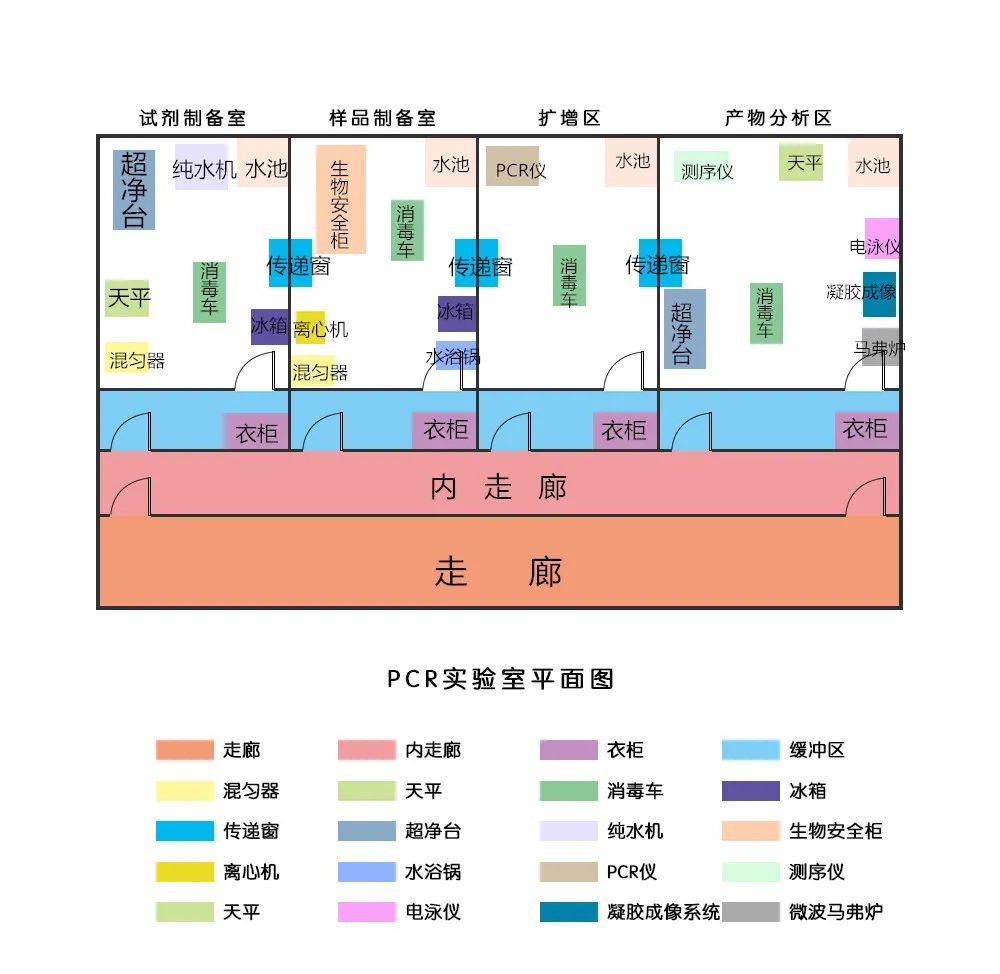 PCR实验室各区功能及主要设备 Pcr实验室又叫基因扩增实验室。PCR是聚合酶链式反应(Polymerase Chain Reaction)的简称。是一种分子生物学技术,用于放大特点的DNA片段,可看作生物体外的特殊DNA复制。通过DNA基因追踪系统,能迅速掌握患者体内的病毒含量,其精度高达纳米级别。那么PCR实验室主要有哪些区以及需要哪些设备呢?下面叫我们一起了解一些把。 1、试剂准备区:主要进行试剂的制备、分装和主反应混合液的制备。试剂和用于样品制作的材料应直接运送至该区,不得经过其他区域。试剂原材料必须贮存在本区内,并在本区内制备成所需的试剂。本区主要设备有天平、冰箱、离心机、加样器、混匀器等。 对于气流压力的控制,本区并没有严格的要求。 2、样品制备区:主要进行样品的保存、核酸(RNA、DNA)提取、贮存及其加入至扩增反应管和测定DNA的合成。本区主要设备有冰箱、生物安全柜、离心机、加样器、混匀器、水浴锅等。 本区的压力梯度要求为:相对于邻近区域为正压,以避免从邻近区进入本区的气溶胶污染。 3、扩增区:主要进行DNA扩增。此外,已制备的DNA模板(来自样品制备区)的加入和主反应混合液(来自试剂准备区)制备成反应混合液等也可在本区内进行。本区主要设备有:扩增仪、加样器、消毒车。 本区的压力梯度要求为:相对于邻近区域为负压、以避免气溶胶从本区漏出。 4、扩增产物分析区:扩增产物的测定。本区主要设备有电泳仪、微波马弗炉、加样器、超净工作台、凝胶成像分析系统等。 本区的压力梯度的要求为:相对于邻近区域为负压,以避免扩增产物从本区扩散至其它区域。 |