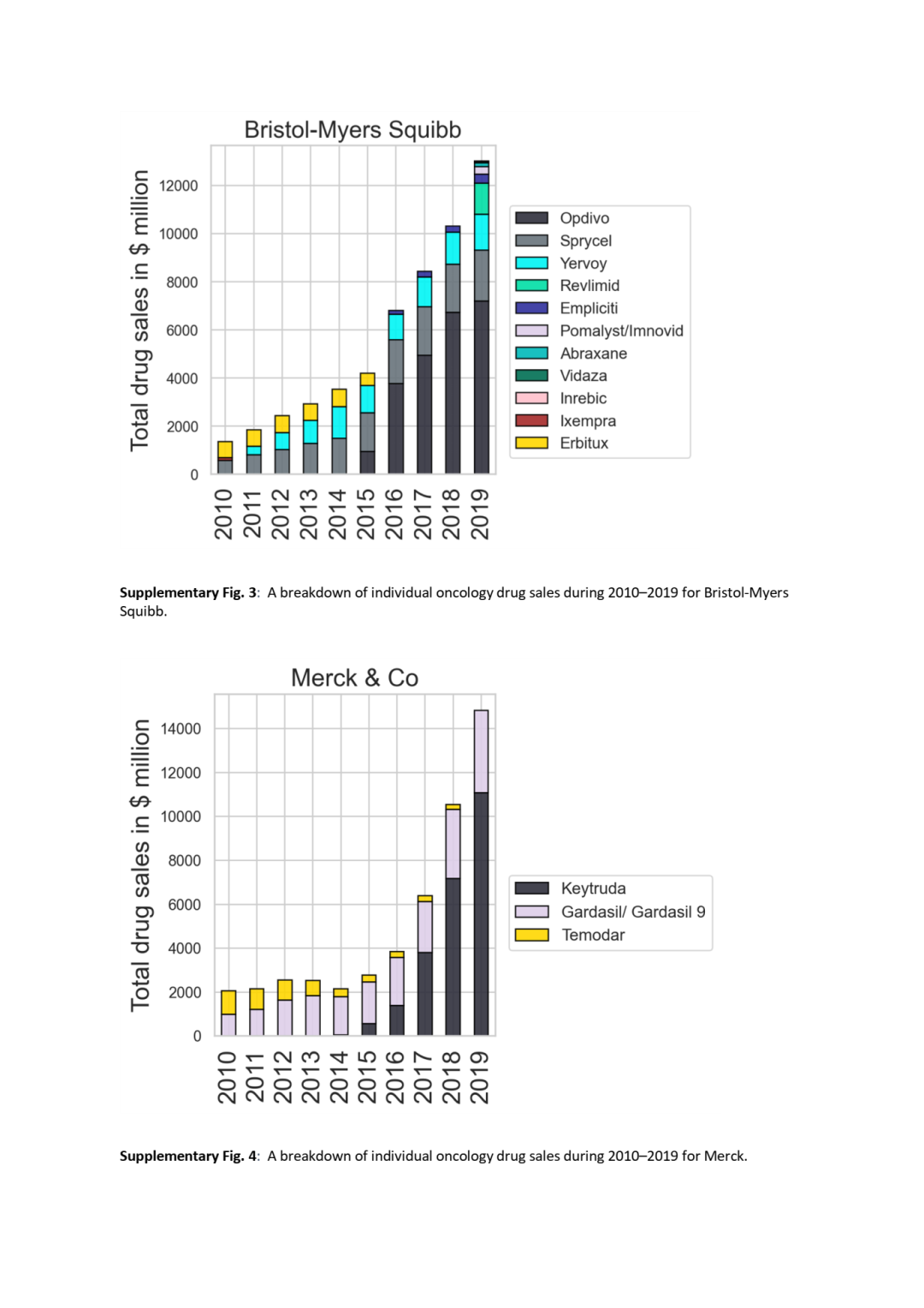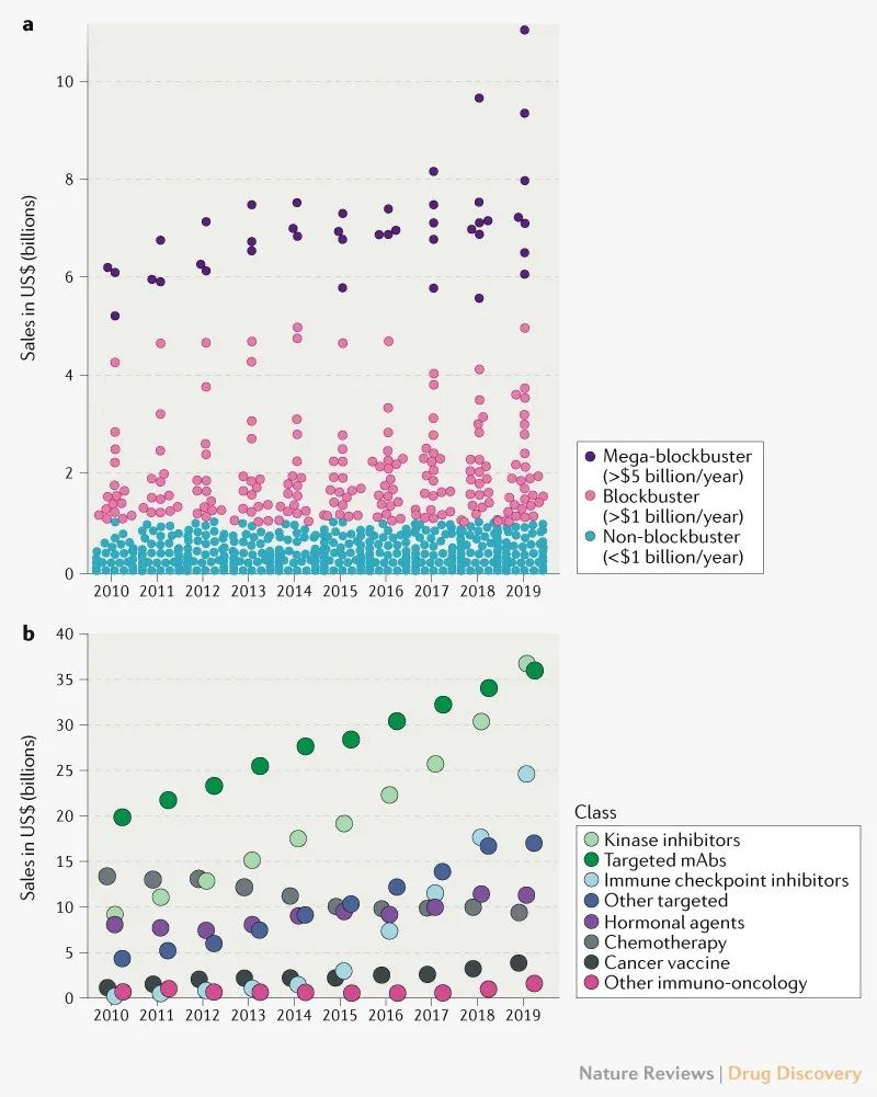 抗肿瘤治疗药物是处方药市场中总销售额最高的治疗领域,并且这些销售额在过去十年中稳步增长(参见相关链接: Oncology remains market-leading therapy area with$142bn sales in 2019)。庞大的患者群体(通常以大量未满足的需求为特征)以及制药公司持续创新,是驱动该领域增长的关键动力。在2021年11月发表在Nature Reviews Drug Discovery的分析报告使用 GlobalData 的药物销售数据分析了过去十年肿瘤药物市场的趋势。 肿瘤药物市场趋势 龙头企业。通过汇总 10 年期间所有公司报告的药物销售额,很明显罗氏在肿瘤药物领域超过了所有竞争公司,在 2010-2019 年期间产生了 2520 亿美元的销售额(图 1a)。新基 (Celgene) 和诺华 (Novartis) 紧随其后,各自的销售额均略高于 800 亿美元。百时美施贵宝 (BMS) 和默克公司分别以 55 美元和 500 亿美元的销售额位列第四和第五位。有趣的是,即使在 2019 年完成 BMS 与 Celgene 的合并之后,两家公司的合并销售额仍会低于罗氏的总销售额。其余公司——强生、阿斯利康、辉瑞、礼来和武田——在分析期间的总销售额均不到 500 亿美元。 图1 | 按公司分列的肿瘤药物总销售额和销售额。A| 2010-2019 年前 10 家公司每家公司的肿瘤药物总销售额。B| 罗氏 2010-2019 年个人药品销售明细。 产生最高收入的药物组合. 对罗氏产品组合的分析表明,三种生物制剂——CD20 特异性单克隆抗体 (mAb) Rituxan/MabThera (rituximab)、VEGF 特异性 mAb Avastin (bevacizumab) 和 HER2 特异性 mAb Herceptin (trastuzumab)——贡献了公司的大部分肿瘤销售额(图 1b)。所有这三项先驱资产均由基因泰克开发,该公司于 2009 年被罗氏完全收购。这三大药物在整个十年中主导着销售额,而罗氏肿瘤产品组合中的新药物从 2014 年起巩固了其收入来源。值得注意的是,罗氏自己的赫赛汀“后续”产品产生了高销售额:HER2 特异性 mAb Perjeta(帕妥珠单抗)和 HER2 特异性抗体药物偶联物 Kadcyla(曲妥珠单抗 emtansine),需要提醒注意的是,由于带着肝损的黑框警告,这个HER2-ADC呃,市场表现差强人意。并且即将面临第一三共/阿斯利康后来者强烈的竞争。 对其余公司的肿瘤药物组合的评估表明,高收入并不是靠着丰富的管线组合造就的。相反,所有领先公司的地位都依赖于产生大部分销售额的几个关键药物Blockbuster(补充图 1-9)。例如,新基(Celgene)的大部分肿瘤药物销售额来自 Revlimid(来那度胺),诺华(Novartis)来自 Gleevec/Glivec(伊马替尼)和 Tasigna(尼罗替尼),BMS 来自 Opdivo(纳武单抗)(补充图 1-3)。 中流砥柱的Blockbuster。在数据集中的 172 种肿瘤药物中,有 49 种已达到“重磅炸弹”的地位,在 2010 年至 2019 年的任何一年中,销售额均超过 10 亿美元。有趣的是,绘制每年的单个药物销售额显示,年销售额超过 50 亿美元的大型重磅炸弹随着时间的推移产生了越来越多的收入,导至仅少数药物的销售额不成比例(图 2a)。默沙东的 Keytruda (pembrolizumab)、Celgene/BMS 的 Revlimid 和 BMS 的 Opdivo 等药物就是这种情况,它们在 2019 年的收入均达到 70 亿美元或更多。 图2 | 选定的关键肿瘤药物每年都会产生更高的销售额。A| 2010-2019 年间每年单个药物销售的箱线图。B| 2010-2019 年用于肿瘤药物的最成熟的药物类别的销售演变。免疫检查点抑制剂是单克隆抗体 (mAb),与其他 mAb 分开分类。有关详细信息,请参阅补充框 1。 最成功的治疗品类。说明过去十年癌症治疗演变的一种方法是根据药物类别回顾单个药物的收入。图 2b 说明了过去十年中各个治疗类别的总收入。随着精准医疗在 2010 年至 2019 年期间在临床中的作用不断扩大,靶向治疗的作用——尤其是小分子激酶抑制剂和单克隆抗体(不包括检查点抑制剂)——已大幅增长。相反,化学疗法的销售额下降,因为旧产品失去专利保护和/或它们的某些用途被新的药物(如靶向疗法)所取代。 从 2010 年到 2019 年化疗的市场份额减少了 17%(相当于 39 亿美元),而靶向治疗(包括激酶抑制剂、靶向单克隆抗体,不包括检查点抑制剂和其他靶向药物)的市场份额合计增加了 560 亿美元,这说明了这一点。 尽管如此,过去十年靶向治疗的大幅收入增长仅代表肿瘤处方药市场整体市场份额的 6% 增长。这种边际增长可以通过将免疫检查点抑制剂引入治疗范式来解释——可以说是过去十年中彻底改变肿瘤药物领域的单一最大因素。自 2011 年第一个检查点抑制剂获批以来,此类药物的销售额,例如 PD1/PDL1 抑制剂 Keytruda 和 Opdivo,已增长至 250 亿美元。 结论与展望 生物技术和制药公司在癌症治疗创新方面的重大努力获得了巨大的商业成功。开发和营销一些关键药物对于成功的肿瘤药物产品组合至关重要,重磅炸弹或超级重磅炸弹获得的不成比例的销售额支持一些公司进入肿瘤药物产品组合的前 10 名。 从 2010 年到 2019 年,免疫检查点抑制剂的兴起以及靶向激酶抑制剂和 mAb 的整合成为成功的肿瘤药物产品组合收入的主要驱动因素。2010 年后,这些肿瘤药物的大部分收入来自受专利保护的品牌产品。主要例子包括默克的 Keytruda、BMS 的 Opdivo、辉瑞的 Ibrance(palbociclib)以及艾伯维和强生的 Imbruvica(伊布替尼)。随着老化的重磅炸弹在下一个十年结束时失去专利,开发新的癌症治疗方法和开发有效的生物类似物将出现新的机会。对于Avastin、Rituxan/MabThera 和赫赛汀等较老的重磅药物,生物类似物的竞争已经开始,并将引入新的市场动态。 确定的一个