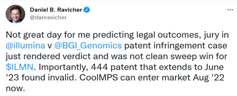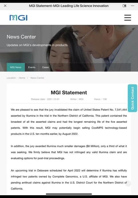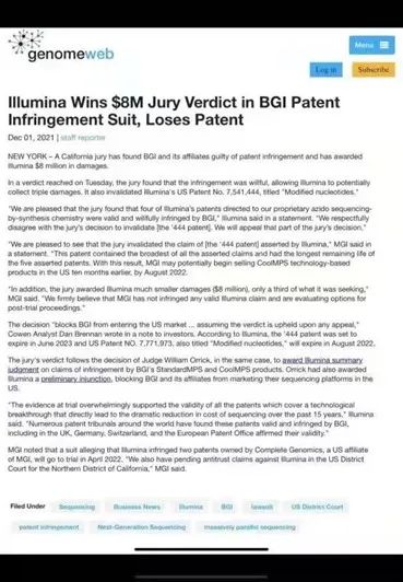 12月1日,据外媒报道,时隔两年多后,全球基因测序行业巨头Illumina在美诉讼华大智造及其他涉案实体专利侵权诉讼案终于有了初步结果,美国加州北部地区法院陪审团裁定: Illumina美国专利号7,541,444专利被裁定无效; 华大智造侵犯了Illumina的部分专利; Illumina获得800万美元的赔偿金,比其索赔金额少了2/3。 来自美国媒体“genomeweb”的报道称,虽然陪审团裁定Illumina可以获得800万美元的赔偿金,但这家全球基因测序巨头却在美国输掉了专利,因为华大智造最快可以在明年8月在美国合法地销售相关测序产品。 华大智造在一封英文版声明中表示,“很高兴看到美国加州北部地区法院陪审团裁定Illumina美国专利号7,541,444专利无效。在5项涉案专利中,该专利所包含的权利范围最广,有效期限也是最长的。若判决生效,将意味着华大智造有可能将比预期时间提前10个月,即2022年8月23日后,在美国正式销售基于CoolMPS测序技术的相关产品。” 据了解,此案始于2019 年 6 月 27 日,Illumina向美国加州法院发起对华大智造及其他涉案实体专利侵权的诉讼,指控其StandardMPS测序方法侵犯了其美国专利号7,566,537和9,410,200。2020年初,Illumina再次提起诉讼,指控华大智造推出的CoolMPS测序技术侵犯了其美国专利号7,541,444和7,771,973,两项专利均名为“修饰核苷酸”,其美国专利号为“标记核苷酸”。 针对陪审团裁定给Illumina 800万美元的损害赔偿金,华大智造在声明中指出,一方面这仅为Illumina原来索赔金额的三分之一,已经大幅下降;另一方面,其坚信没有侵犯任何来自Illumina的有效专利,“正在评估如何在后续审判中维护自身的权益。” 对此有业内人士分析到,“从目前陪审团的裁定结果来看,对华大智造已是相当不错,不仅赔偿金额比预期缩水不少,而且其中关键的一条涉案专利被判定无效,若美国法院最终接受陪审团的意见,华大智造在美国市场能销售基因测序仪产品只是时间问题。” 值得一提的是,除了本案之外,华大智造在声明中强调,其诉讼Illumina涉嫌故意侵犯了华大智造美国子公司Complete Genomics的两项专利的诉讼案,计划于2022年4月在美国特拉华州举行庭审。 此外,华大智造此前还在加州北部地区法院对Illumina提出了反垄断诉讼,该诉讼仍在进行中。 |