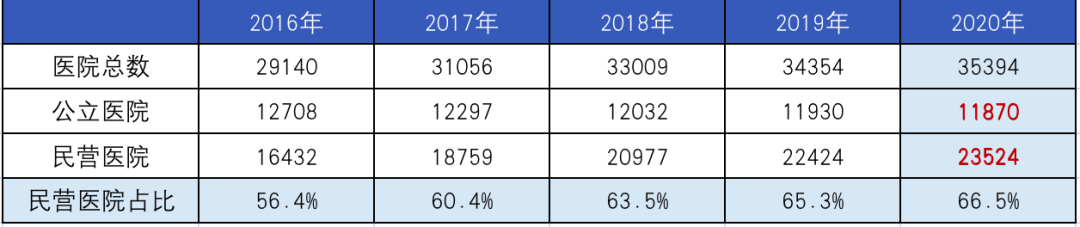 总体来看,分级诊疗之下,基层医疗卫生机构数量逐年增长,疫情更是加速了这一进程。 ▲公立医院和民营医院数量以及服务量数据(2016-2021) 医疗机构数量方面,2020年,全国医疗机构总数达35394家,相比上年,总体增长近1000家,几乎全部来自民营医院: