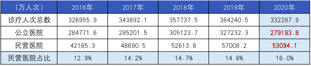 诊疗人次方面,疫情之下,公立与民营医院都受到了不小的冲击,2020年总诊疗人次达33亿,整体同比-14%: