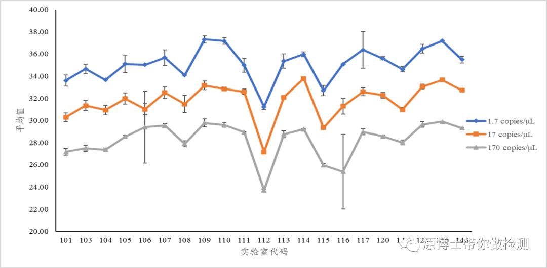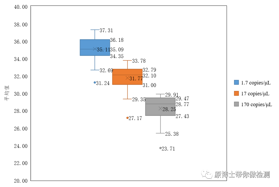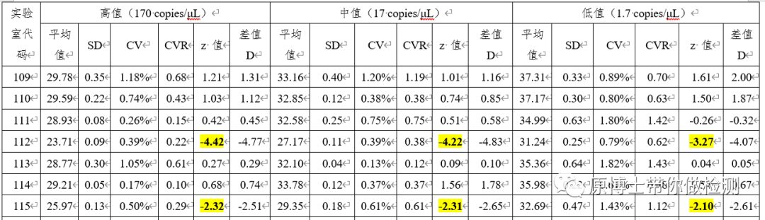 一般情况下Z值的判定仅适用于符合正态分布的数据,因此如Ct值这类经过转换过的数据不适用于Z值的判定,但是目前大家也都还在使用(可能是还没有找到更好的评价指标)。所以我对Ct值结果进行Z值判定时,通常选用2作为是否满意的标准。 尧敦图Youden plot:能显著地表示出实验室的系统偏差。超过95%概率的置信区域为有疑问结果(警戒信号),超过99%概率的置信区域为不满意结果(行动信号)。 其他:还有很多统计方法正在学习中。。。 (2)每个参加实验室的结果分析 对每个实验室的检测结果进行统计汇总 (3)每个浓度所有实验室的汇总分析 X、SD、CV、Max、Min、R、Med和四分位距