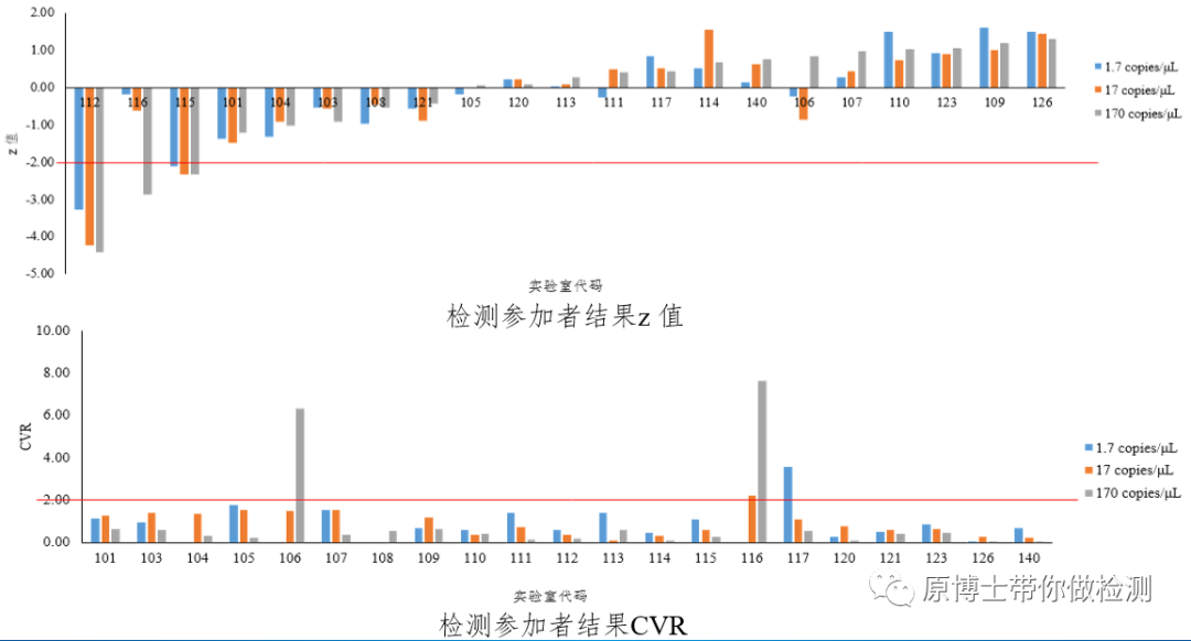 箱线图 (4)每个浓度各家实验室的统计分析 计算每家实验室`X、SD、CV、CVR、Z、D z值和CVR图 实验室104,116,117 CVR大于2,结果不满意,需要采取行动,提示检测精密度存在问题。 实验室114,115 | Z |大于2,需要警惕;实验室112 | Z |大于3,结果不满意,需要采取行动,提示检测准确度存在问题。 (5)评估每个实验室在该项目的整体水平 Youden plot图 Youden plot显示实验室106 超出95%置信区间,需要警惕;实验室116和112超出99%置信区间,结果不满意,需采取行动。 4.比对结果分析和建议 在《2021年全国新型冠状病毒核酸检测(接收集中隔离点样本检测机构)室间质量评价/能力验证(1月)》中就给出了结果和和建议: “本次EQA/PT成绩合格的实验室占98.2%(933/950)......1.2×104 copies/mL的样本有9家实验室未检出,这两份强阳性样本的漏检,说明这些实验室的检测能力存在严重问题。3.0×103 copies/mL的样本有14家未检出,根据《医疗机构新型冠状病毒核酸检测工作手册(试行第二版),“对集中隔离人员,应选择高灵敏(检测限≤500copies/mL)的试剂”,因此,3.0×103 copies/mL的漏检同样不应该出现。 ......说明部分基层医疗机构、疾控部门核酸检测实验室亟需提高人员素质和质量管理能力,这些实验室必须认真寻找原因,进行整改,例如加强人员操作培训;对包括人员、仪器、试剂、环境和标准操作程序在内的实验室检测系统(人、机、料、法、环)重新进行性能验证,以保证实验室检测质量,避免假阴性结果;同时,采用弱阳性质控品(通常为检出限的1.5~3 倍)进行室内质量控制,以在日常工作中监测实验室对弱阳性样本的检测能力等。 后续临检中心将进一步加强对实验室检测能力,特别是弱阳性样本检测能力的考核,从而促进接收隔离点新型冠状病毒核酸检测样本的核酸检测实验室的质量改进和检测能力的提升。 ” 5.纠正措施 能力验证的目的是发现不足,及时采取纠正措施,进而提高实验室的能力。所以能力验证完成后,如果出现警戒或不满意结果,需要从“人机料法环”各个环节开展实验室内部的质量控制,及时发现问题,解决问题。通常采取的纠正措施有: (1)核查相关人员是否理解并遵循测量程序; (2)核查测量程序的所有细节是否正确; (3)核查设备校准和试剂的成分; (4)更换可疑 的设备或试剂; (5)与另一个实验室进行人员、设备和/或的试剂的比对测试等。 (6)采取纠正措施后应再次申请PT,验证整改的效果。 6.连续能力验证计划 实验室可参加连续能力验证计划监测其工作质量随时间的变化情况。参加的连续能力验证需是同一参数在相同或近似水平范围内的多轮次能力验证计划,可以识别出与随机误差、系统误差或人为错误等相关的潜在问题。 连续能力验证结果的利用可采用统计或图示的方法进行,其中将多轮次的能力评定结果制成控制图,以此来监测实验室工作质量随时间的变化,识别实验结果的趋势和其他特征。 7.能力验证结果不是处罚实验室的依据! 一次能力验证结果并不一定证明参加者的能力或技术水平的优劣 。即使在一个运作良好、有经验丰富工作人员的实室,偶尔也会得到异常数据;同样,即使一个已由精密度试验验证为有效的标准测量方法 ,也有可能存在缺陷,而这个缺陷,而这个缺陷可能只在多轮能力验证后才显现;并且能力验证计划本身也可能存在缺陷。因此能力验证的结果不宜作为处罚实验室的依据。 本文能力验证相关案例数据和图片由北京中科基因技术股份有限公司和普道(北京)标准技术有限公司友情提供。 |