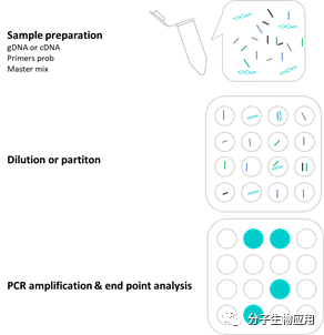 数字PCR(dPCR)工作流程。分离基因组DNA(gDNA)或将mRNA样品转换为cDNA后,添加预混液,靶标特异性引物和探针。混合液经过稀释和分区,每个分区中有1个或0个目标。PCR扩增后,记录每个孔或液滴的荧光信号。阳性孔或液滴的数量提供了样品中起始目标gDNA或cDNA分子数量的准确计数。 Step1:样本制备 与所有基因组分析一样,必须获得核酸样品。对于基因分型应用,需要从目标组织或样品中纯化基因组DNA(gDNA)样品。为了进行基因表达分析,需要分离目标mRNA并通过逆转录酶分析将其转化为cDNA。与qPCR一样,dPCR使用热稳定的DNA聚合酶扩增靶DNA,因此无法直接扩增RNA。 获得纯化的gDNA或cDNA后,将样品与正向和反向引物以及水解探针混合,水解引物设计为具有与目标靶基因/DNA互补的序列。引物退火至靶序列的外部区域,与典型的PCR反应相同,水解探针是为了提高检测特异性,5'核酸酶(水解)探针在正向引物和反向引物之间退火,水解探针包括5'荧光团和3'淬灭剂。与传统的qPCR分析一样,引物和探针设计是获得准确结果的关键。由于数字PCR检测和qPCR检测的设计相似,引物探针设计原则基本相同,但是dPCR对引物特异性要求较高,请参考探针设计注意事项。 数字PCR,也可以使用SYBR或EvaGreen嵌入双链DNA染料完成检测,而不是5'核酸探针。这些引物的设计至关重要,因为无法将引物二聚体的扩增与靶标的扩增区分开。使用公认的测定方法并对产品进行熔解曲线分析可以确保测定的特异性。 Step2:dPCR反应液分区 尽管数字PCR反应体系与qPCR测定相同,但数据生成阶段有所不同。dPCR分析首先将反应分为数万个纳升反应,因此每个分区中有1个或0个目标DNA分子。不同厂家实现分区的方法各异,在某些dPCR平台中,反应被分为单个的微孔,而其他dPCR平台则以油/水乳液形式产生纳升大小的反应液滴。dPCR不能像qPCR那样实时分析单个扩增反应,而是采用终点检测方法,检测10,000多个单独的PCR反应。 Step3:PCR扩增和终点检测 分区完后,使用常规PCR循环参数扩增微分区中的模板DNA。当DNA聚合酶在循环的延伸/延伸部分从正向引物延伸时,其核酸外切酶活性会使探针降解,从而释放5'荧光团,进而释放出可检测的荧光。如果测定包括插入染料而不是水解探针,则荧光会随着双链PCR扩增子的积累而增加。 PCR循环完成后,任何包含1个模板或目标DNA序列的分区都将发出荧光。缺少目标DNA的任何液滴或孔都不会发出荧光。带有荧光的液滴或孔的总数代表样品中目标分子的总数。从统计学上讲,某些分区有机会具有多于1个的目标DNA,可以通过应用泊松分布函数最终确定样品中目标分子的总数来进行校正。