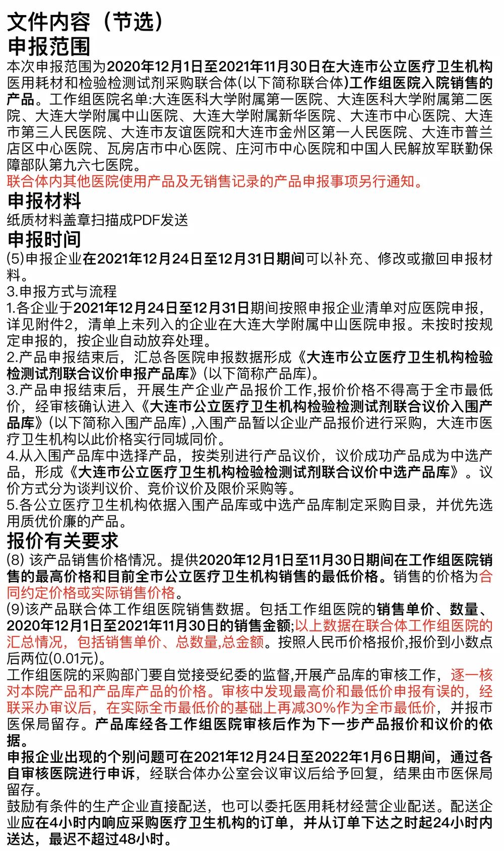 1. 关于申报资格。如果在12家工作组医院没有销售,无法提供发票,是没有资格参加这次大连市的联合议价的,这一点大家要明白。所以这次议价的品种非常有限,非常少,只是针对做过这12家医院,有销售记录的试剂厂家。 2. 没有资格参与怎么办?不用恐慌,以前在其他医院该怎么卖还是怎么卖,可以就等后期再进行增补,预计明年很快就要开始了,因为现在年前肯定可以议完在12家工作组医院有销售记录的这一批。但值得注意的是,就算后期进行增补了,恐怕也会优先考虑在大连公立医院有销售,也就是有卖过,可以提供有效发票进行证明的产品。大连这个市场,在以往锦州葫芦岛或者辽阳市标,都是非常重视医院实际的销售记录,在发票的基础上议价。 3. 关于同城同价。听了非常恐慌对吧,其实地级市招标议价都是这样,一旦中标就按中标价格执行,中标多少价格就按多少价格,这很正常。这次议价采集的是工作组医院最高价及全市公立医院最低价,大家都知道发票的价格都是比较低的,所以能进入这批申报也未免是一个好事,起码对于能申报的企业来说,他采集到的产品规格受影响是非常大的,全市都要全面降价。 4. 关于入围价与中选价。入围价不得高于全市最低价,如果高于最低价,则报价失败,也就无法入围,如果同意,便可同城同价;专家组按类别进行产品议价,议价成功便是中选价,议价常见的办法就是直接给厂家打个折,接受就中选,不接受就给出理由说服专家组,说服不了就淘汰。 5. 关于入围与中选。先说入围,如果没中选有入围,只要是入围产品,就可以全市同一个价格销售;中选的话肯定是最有利的,中选库比入围库还更高一层次,彰显产品质量更好,降价力度更大。能在这12家工作组医院销售的产品,如果后期议价中选,那无疑也是非常有利的,所以利弊共存。在这两年期间,不仅稳定了在这12家医院供货地位,而且还更有利于在全市其他医院推进中选产品,毕竟这是医保局遴选出来的第一批优质优廉的产品。 小结: