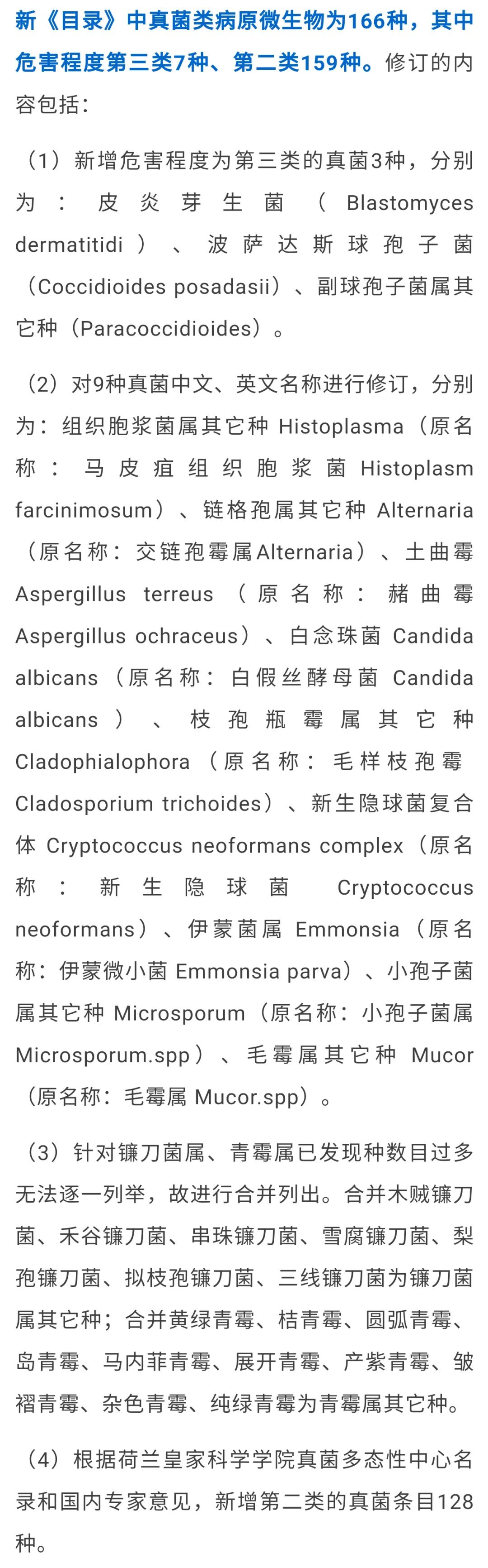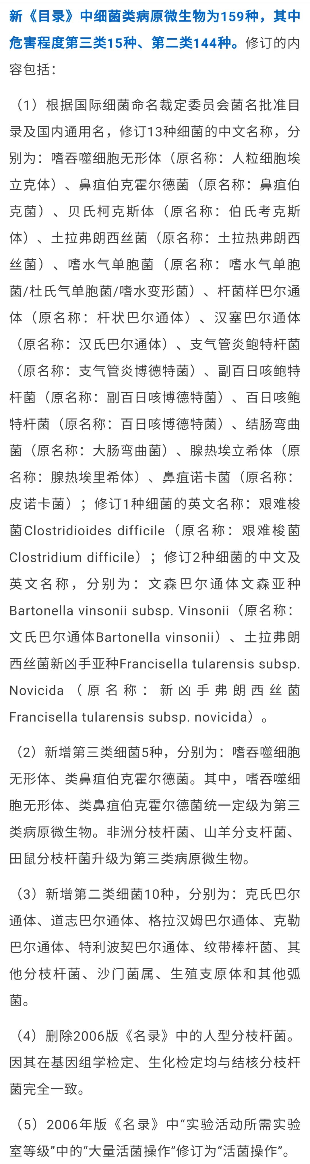 太长不看版 新《目录》的分类将与世卫组织的分类接轨,按病原微生物的危害程度由高到底分为第四类、第三类、第二类、第一类。其中,第四类有28种、第三类有71种、第二类有394种、第一类有6种,合计499种。 尽管过去我们战胜过几次病毒,但我们从来没有赢过细菌。 它们几乎是不可能被消灭的,人类和病原微生物的战争可能永远也不会结束。 对抗传感染病,还需要大家保持守脑如玉,一起努力,用人类的团结和智慧,保持持续胜利的态势。 图:国家卫健委发布《名录》征集意见稿 这两年,新冠肺炎疫情席卷全球,大家对致病微生物的关注度也空前高涨,日前,国家卫健委办公厅又发布了《人间传染的病原微生物目录》征求意见稿,尹哥也对其进行研读,今天就和大家一起看一看新旧目录有何异同。 新《目录》分类 新《目录》的分类将与世卫组织的分类接轨,按病原微生物的危害程度由高到底分为第四类、第三类、第二类、第一类(过去的分类由按危害程度由高到底分为第一类、第二类、第三类、第四类)。其中,第四类有28种、第三类有71种、第二类有394种、第一类有6种,合计499种。 图:《目录》修订前后各病原体数量及分类对比 修订的内容 病毒类 图:中东呼吸系统综合征冠状病毒 细菌类 图:土拉弗朗西丝菌(蓝色)感染巨噬细胞 真菌类 图:白色念珠菌 战火何时休 上一版《人间传染的病原微生物名录》是原国家卫生部于2006发布的,距今已经过去了16个年头,里面有不少老面孔,至今也还是人类的大麻烦,如埃博拉病毒、艾滋病毒等;也有不少老对手,现在才是《目录》的新面孔,比如这些年沸沸扬扬的中东呼吸综合征冠状病毒、新冠病毒等。更应该让人感到恐惧的是《目录》里数量庞大的真菌和细菌,要知道,尽管过去我们战胜过几次病毒,但我们从来没有赢过细菌。 都说有人的地方就有“江湖”,病原微生物们就是这样一个“江湖”,它们几乎是不可能被消灭的,人类和病原微生物的战争可能永远也不会结束。而新冠疫情更清醒的告诉我们,没有一个个体能在大流行中独善其身。对抗传感染病,还需要大家保持守脑如玉,一起努力,用人类的团结和智慧,保持持续胜利的态势。 尽管《目录》上的各种病原微生物越来越多,但尹哥还是衷心的希望,我们的麻烦可以越来越少。 - END - |