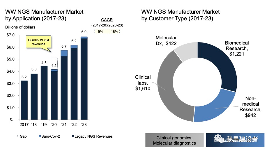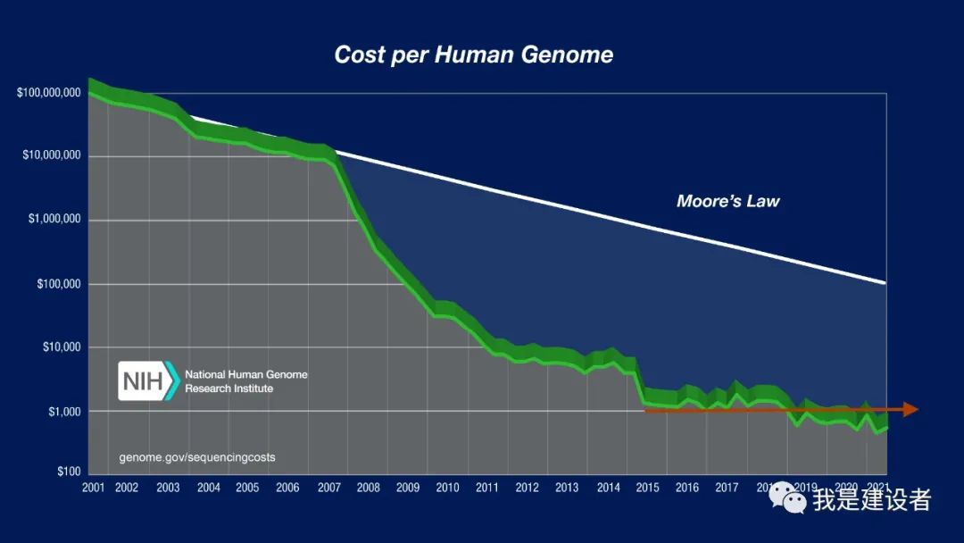 在今年8月份的时候,我是建设者号内读者投票调查,“你更看好未来三年哪家公司的发展?”,结果显示ILMN/PACB/ONT/MGI的得票数较多,大家对于ONT和MGI的期许更高,PB也逐渐走强。当然,这个调查参与者人数有限,不可能反映这几家公司未来三年在中国或者全球市场的占有情况,但可能部分反映了中国市场的用户对全球市场竞争情况的认知。 关于基因测序的市场规模,市面上流传的数字各不相同,最近几年我们也难看到关于各家测序仪厂商的市场占有率的更新。在ONT上市招股书中,公司采用了咨询公司DeciBio的预测数字,个人觉得可以作为一个参考。高通量基因测序的市场规模(包括设备和耗材,不包含相应的服务)预期从2020年的42亿美元增长到2021年的57亿美元,2020年到2023年的年复合增长率为18%。如果按照这个市场规模测算,Illumina毫无疑问占据绝对的市场主导地位(~67%),而PacBio和ONT的市场份额可能都小于3%(~2.5%)。 ONT上市招股书中所引用的DeciBio市场研究报告 如果我们关注基因测序行业的超摩尔定律曲线,会发现基因组测序的价格横停在1000美元这个区间已经有好几年了,这与行业先驱们20多年前提出的100美元基因组测序目标仍有一段距离。如何能做到提供更低的测序成本成为初创公司和行业主要玩家的一个竞争衡量维度。