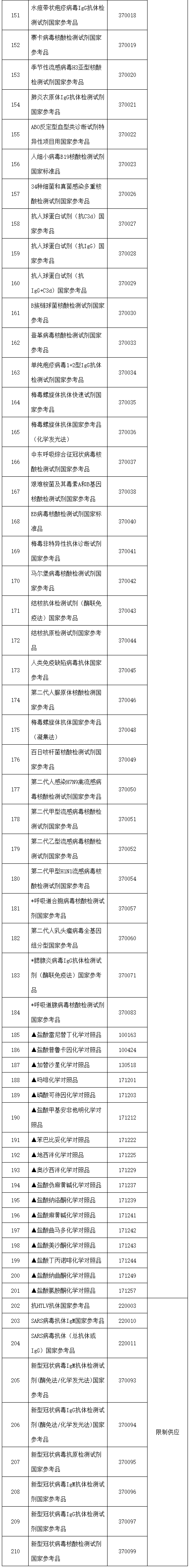 注: 1. *标识品种为本期目录新增体外诊断试剂标准物质。 2. ▲标识品种为可用于体外诊断试剂检验的化学对照品。 3. 相关品种电子版说明书可到中国食品药品检定研究院网站http://aoc.nifdc.org.cn/sell/home/search.html,点击目录查询,进行在线浏览。 4.限制供应是指仅供给相关体外诊断试剂生产企业。 5.《注册检验用体外诊断试剂国家标准品和参考品目录(第十一期)》发布之日起,《注册检验用体外诊断试剂国家标准品和参考品目录(第十期)》同时废止。