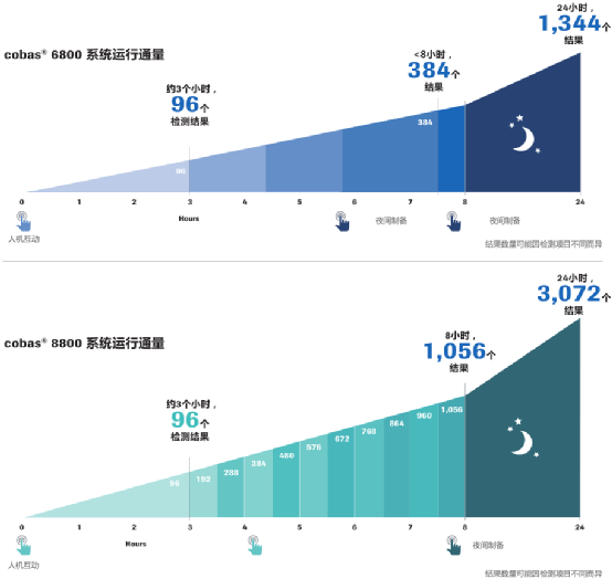 (1)仪器样本容量可达350个,3.5小时内可完成96个检测结果;3.5小时之后,Cobas 6800/8800分别每隔90/30分钟出96个检测结果,在8小时检测过程中,Cobas 6800可产生384个结果、Cobas 8800可产生960个结果。