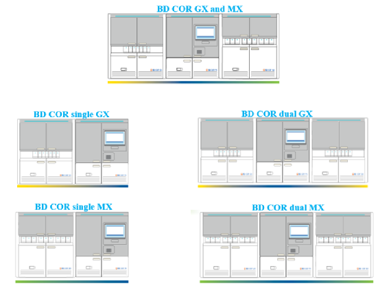 (2)三个独立模块可进行组合,预分析模块(BD COR™ PX)与单个或两个分析模块(BD COR™ GX和或BD COR™ MX)可搭配成5种形式。