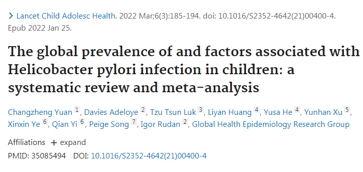 临床资讯,1s触达参考资料: [1].李兴川,王海东,张妮,王玉平,周永宁.中国儿童及青少年幽门螺杆菌感染流行病学调查的系统评价和meta分析[J].临床儿科杂志,2017,35(10):782-787. [2].Yuan C,Adeloye D,Luk TT,Huang L,He Y,Xu Y,Ye X,Yi Q,Song P,Rudan I;Global Health Epidemiology Research Group.The global prevalence of and factors associated with Helicobacter pylori infection in children:a systematic review and meta-analysis.Lancet Child Adolesc Health.2022 Mar;6(3):185-194.doi:10.1016/S2352-4642(21)00400-4.Epub 2022 Jan 25.PMID:35085494. |