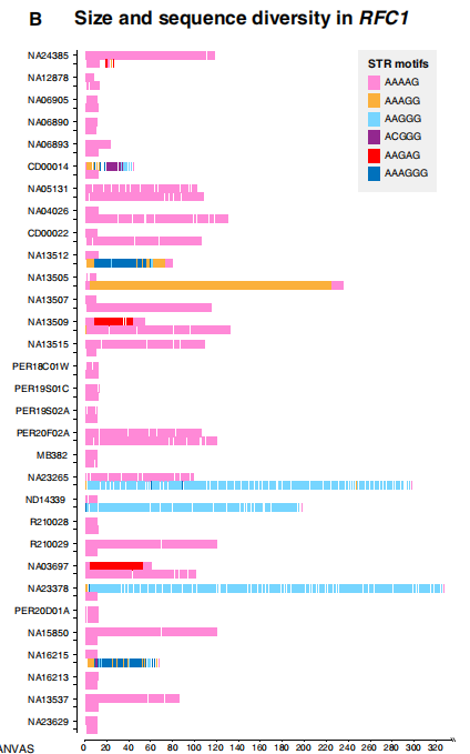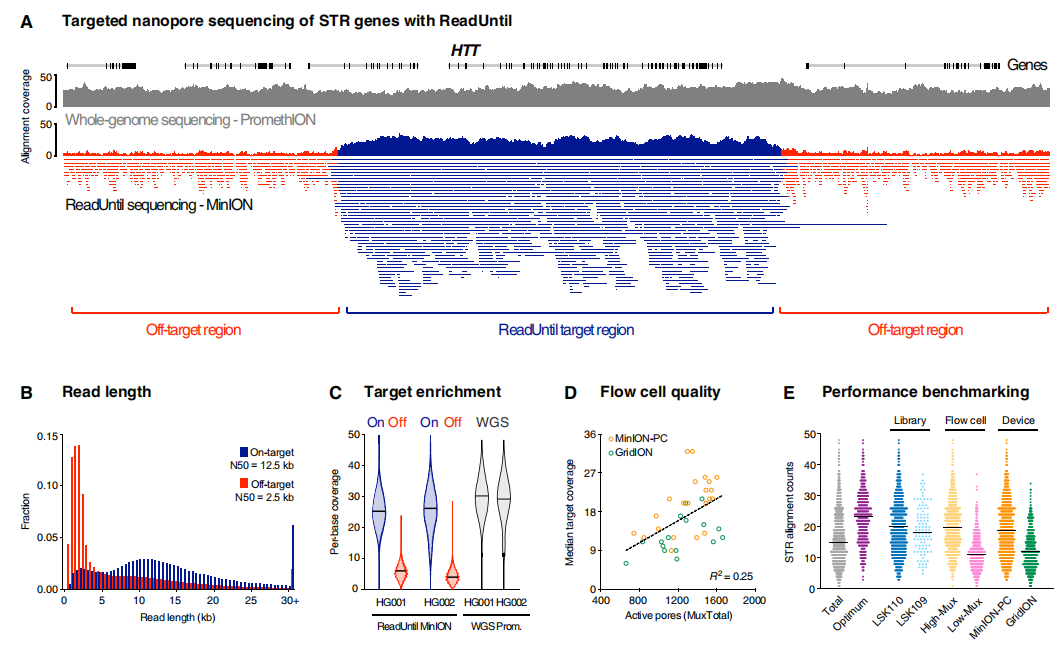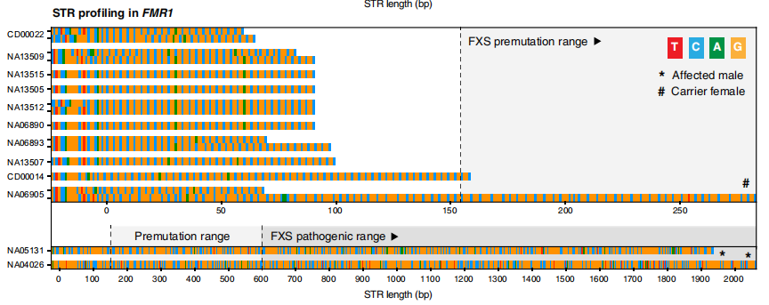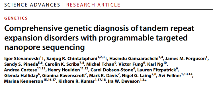 短串联重复序列(STR)是一种短DNA序列基序,通常为2到6个碱基对(bp),在基因组中的给定位置连续重复。STR约占人类基因组序列的7%,具有高度多态性,通常在无关个体之间长度不同。异常长或“扩展”的STR等位基因是人类群体中一类重要的致病性变体。迄今为止,已有40多个基因的STR扩展被证明会导至遗传性疾病,其中大多数表现为原发性神经或神经肌肉表现。这些疾病包括亨廷顿病(HD;HTT)、脆性X综合征(FXS;FMR1)、遗传性小脑共济失调(RFC1、FXN和其他)、强直性肌营养不良(DMPK和CNBP)、肌阵挛性癫痫(CSTB、SAMD12、STARD7和其他),以及C9orf72相关的额颞叶痴呆和肌萎缩侧索硬化(ALS)。据估计,这>40个STR相关的神经遗传疾病中,每10万人中约有1至10人感染其中一种,它们的总体患病率很高。此外,与STR扩展相关的疾病列表仍在增加,许多致病性STR基因最近已被描述。 鉴于(i)STR扩展障碍的广泛多样性和总体高患病率,(ii)涉及的基因数量众多,(iii)新基因的频繁识别,(iv)致病性STR扩展等位基因的大小和序列构象多样性,以及(v)我们对其基本生物学的理解存在许多差距,人们越来越需要改进的STR分子表征方法。已建立的分子技术,例如,Southern杂交和重复引物聚合酶链反应(RP-PCR),相对缓慢、劳动密集且不精确,需要对每种不同的STR分别使用特定的引物/探针进行检测。当多个不同的STR扩展可以表现为相似的表型(基因座异质性)时,这成为一个问题,并且是对新识别的STR基因进行检测的主要障碍。下一代测序(NGS)对STR扩展的分析有一定的实用价值。然而,许多致病性STR扩展的大尺寸、低序列复杂度和高GC含量使得它们难以通过短读NGS平台(例如Illumina)进行分析。 Oxford Nanopore Technologies(ONT)和太平洋生物科学公司(Pacific Biosciences)的长读测序技术可用于对大型复杂STR扩展进行基因分型。同时分析重复位点的DNA甲基化是这些技术的另一个优势。然而,在这两种平台上进行全基因组分析的成本仍然高得令人望而却步。最近开发了一种基于cas9的STR基因座定向富集和长读测序方法。然而,这与现有的分子技术有着相同的局限性,因为每个不同的STR都需要一组独特的cas9导向RNA,需要仔细设计和实验优化。定向长读测序的另一种方法是ONT的“ReadUntil”功能,通过该功能,可以对ONT测序设备进行编程,以便在测序实验期间识别和接受/拒绝特定的DNA序列片段。目标选择是完全灵活的,除了标准的库准备外,不需要额外的实验室过程。 近日,来自澳大利亚和以色列的研究团队在SCIENCE ADVANCES杂志上发表了一篇题为“Comprehensive genetic diagnosis of tandem repeat expansion disorders with programmable targeted nanopore sequencing”的文章。在文章中,研究团队使用一个由37个与神经和神经肌肉疾病相关的STR基因座组成的定制panel,使用可编程的靶向长读测序和Oxford Nanopore的ReadUntil功能,在一次分析中对所有已知的神经源性STR进行平行基因分型。这种方法可以正确诊断一个小队列(n=37)中的所有个体,包括患有各种神经遗传疾病(n=25)的患者。有针对性的长读测序解决了大而复杂的STR扩展,这些扩展会混淆已建立的分子检测和短读测序,并识别非标准STR基序构象和内部序列中断。研究团队还观察到已知和未知致病基因的STR等位基因多样性,这表明长阅读测序将重新定义重复性疾病的遗传格局。研究证实了可编程ONT测序在STR扩展障碍基因诊断中的分析有效性,并展示了这种方法的诸多优势。 图片来源:Science Advances 主要内容 致病性STR的可编程靶向nanopore测序 ONT的ReadUntil功能有可能对所有已知致病性STR基因座进行简单、经济高效的测序,但这是一项基本上未经测试的技术。为了评估ReadUntil在STR分析中的应用,研究团队设计了一个定制panel,包含所有已知的与原发性神经和神经肌肉疾病相关的致病性STR扩展基因。对于每个基因,整个位点,包括两个方向的50kb侧翼序列都被包含。该panel包括一系列额外的临床信息位点,总共覆盖了约50.5 Mb,相当于人类参考基因组的约1.6%。 研究团队使用开源软件包Readfish对37个基因组DNA样本进行了靶向测序。结果显示,与目标读取(N50=12.5 kb)相比,非目标读取(N50=2.5 kb)的读取长度持续减少,这表明成功地拒绝了目标区域之外的片段。这导至目标区域内测序深度的中位数增加了4.6倍,在整个队列中产生了约9到40倍的目标覆盖率。 使用ONT ReadUntil对致病性STR位点进行定向测序。 图片来源:Science Advances 可编程靶向STR测序的有效性和实用性 为了确定靶向纳米孔测序分析的有效性和实用性,研究团队分析了一系列患者来源的参考DNA样本和神经遗传疾病患者(n=25)的DNA样本,包括HD(n=5);FXS(n=2);小脑共济失调、神经病变和前庭无反射综合征(CANVAS;n=6);Kennedy脊髓和延髓肌萎缩(SBMA;n=1);强直性肌营养不良1例(DM1;n=5);神经元核内包涵体病(NIID;n=1);弗里德赖希共济失调(FRDA;n=2);ALS(n=1);脊髓小脑共济失调1型(SCA1;n=1);眼咽肌营养不良症(OPMD;n=1),以及已知的突变前携带者(n=6)和未受影响的个体(n=6)。样本已在经认证的遗传病理学实验室或使用标准方法进行独立分子检测。 1. 亨廷顿病 HD是一种常染色体显性遗传神经退行性疾病,由HTT基因中≥36个“CAG”基序STR扩展引起,在≥40拷贝时完全外显。STR扩展大小与疾病严重程度相关,扩展等位基因内缺乏特征性的“CAA”中断基序也是如此。因此,HD的基因诊断需要准确的等位基因特异性STR测定和内部序列测