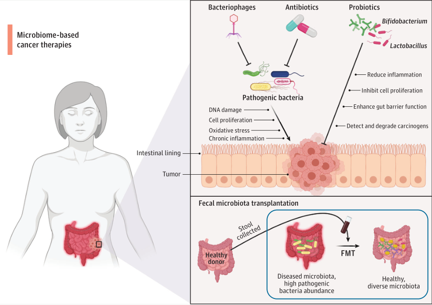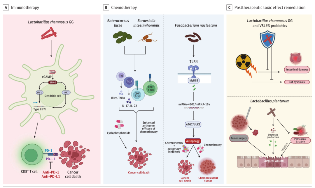 遇事不决,量子力学;机制不明,肠道菌群!除了DNA,感觉对人体产生最大影响的就数肠道菌群了。万能的肠道菌群,无论什么研究领域,哪儿那儿都有它的影子。这篇文章大伙儿还是看一看,说不定什么时候,你就会发现肠道微生物群检测成了癌症治疗的常规辅助检测方法。 近日,来自哈佛大学的研究团队在高分杂志JAMA oncology上发表了一篇题为“The Potential of the Gut Microbiome to Reshape the Cancer Therapy Paradigm”的文章,在文章中,作者从临床角度全面综述了胃肠道微生物组与免疫治疗、化疗、放疗、癌症手术等治疗反应的关联性,同时作者认为应该探索对一些最具挑战性的肿瘤进行治疗时,结合微生物制剂进行可能的综合治疗策略。 图片来源:JAMA Oncology 背景 人类微生物群包括细菌、古细菌、真菌和病毒等在个体中表现出巨大的种群变异。长期以来,人们一直认为,肠道微生物群中的微生物只对食物的消化和营养的获取起作用;然而,随着新的分子技术(即16S rRNA测序、DNA测序和宏基因组学)的出现以及无菌小鼠的作用,肠道微生物在维持系统稳态的作用被揭开。首先,微生物通过产生或转化神经递质、短链脂肪酸(SCFA)、氨基酸和次级胆汁酸,来维持循环营养素和代谢物水平的平衡。此外,微生物对免疫系统的培养和发育具有重要的控制作用。例如,某些常见的细菌种类可能会诱导某种免疫细胞极化,并产生炎症性或抗炎性作用,有时甚至会最终导至免疫抑制。因此,越来越多的人需要将微生物群的重要性与肿瘤发展、诊断和治疗联系起来。 肠道微生物病与癌症的发展 当肠道中的细菌微妙的平衡被破坏时,导至多样性较小、不稳定,而且往往是更具致病性的微生物群,通过负面影响宿主代谢或宿主免疫反应和功能,导至各种疾病病理学。胃肠道微生物生态失调与肿瘤的发生密切相关。 幽门螺杆菌感染和随后诱发的胃炎的发展密切相关,被认为是癌症的前兆。在胃上皮细胞中,幽门螺杆菌诱导p53(一种抑癌蛋白)的降解,从而导至胃癌的形成;此外,幽门螺杆菌来源的CagA蛋白与上皮E-cadherin相互作用,促进细胞增殖,增加致癌细胞转化的可能性。由细菌病原体产生的毒素,如大肠杆菌素和细胞致死性膨胀毒素,具有导至肿瘤形成和进展的DNase酶活性。此外,致病细菌如福氏志贺氏菌和拟杆菌,分别通过宿主DNA损伤反应干扰或通过精胺氧化酶活性产生氧化应激来积累DNA损伤。此外,某些物种甚至可以通过抑制宿主抗肿瘤免疫反应来帮助癌症形成。 肠道细菌也与其他癌症有关。已知伤寒沙门氏菌和螺杆菌与胆管癌的发生有关,并认为肠道微生物群会影响肝、乳腺癌的发生。肝脏通过门静脉系统暴露于肠道细菌、代谢物和副产物的传播中。在乳腺癌中,类固醇代谢可能与肠道细菌有关,导至植物雌激素和雌激素的变化,这些激素可能在抗癌中发挥作用。脑肿瘤是另一个被推测受微生物群影响的新兴领域,因为微生物群——肠道——脑轴的影响越来越大。 胃肠道微生物生态失调与肿瘤的发生密切相关 图片来源:JAMA Oncology 肠道微生物群和免疫治疗 使用免疫检查点阻断(ICB)的免疫疗法,在靶向PD-1和CTLA-4方面取得了显著进展。尽管这些新的ICB策略很有前途,但它们在个体间有很大的差异,并且在肿瘤类型之间治疗的效果并不一致。因此,迫切需要一种预测性的生物标记物,以应对并更好地理解为什么存在这种异质性,从而提高治疗效果和相应人群。 几项研究已经注意到ICB治疗的应答者和无应答者在微生物多样性和组成方面的重要差异,这表明包括临床应答在内的变异可能归因于肠道微生物群。且实验证明了微生物调节剂影响ICB的疗效。已知某些活菌或益生菌在癌症修复中发挥关键作用,包括影响抗炎细胞因子水平、检测和降解潜在致癌物、激活吞噬细胞清除早期癌细胞,以及产生影响细胞死亡和增殖的SCFA。 通过抗生素药物和噬菌体靶向肠道人群的免疫治疗也需要额外关注。例如,万古霉素通过降低有害的革兰氏阳性菌可以提高CTLA-4阻断疗法的疗效,同时不影响革兰阴性菌。然而,由于对相似类型的菌株没有精确的靶向性,抗生素药物可能会通过减少细菌多样性而造成不良影响。例如,一项研究发现,联合应用抗肿瘤药物和免疫治疗可缩短癌症患者的无进展生存期和总体生存期。因此,作为抗生素的替代,噬菌体可以专门针对有害的致病细菌。当与检查点抑制剂或血液疗法相结合时,将具核梭杆菌结合的M13噬菌体与银纳米颗粒相结合,可显著减少骨髓源性抑制细胞,从而显著延长小鼠模型的总体存活时间。 总的来说,利用微生物组增强免疫疗法是有希望的。然而,尽管抗肿瘤免疫反应与健康和多样的菌群呈正相关,但在识别临床队列中重叠的细菌种类方面存在显著差异。因此,需要寻找产生的共同的功能产物和代谢产物。最近的一项研究提供了支持这一点的证据,显示了多种肠道细菌产生的SCFA可促进抗原激活的CD8+T细胞的记忆潜能。考虑到所有这些因素,可能需要重新设计免疫疗法,将微生物调节治疗元素(例如益生菌或微生物衍生代谢物的补充)合并为一种标准化方法,以最小化异质性和增强免疫效果。 微生物调节剂影响癌症治疗的疗效 图片来源:JAMA Oncology 肠道菌群与化疗 微生物群也参与介导化疗药物的治疗反应。例如,环磷酰胺是一种用于化疗的免疫刺激烷基化剂,已被注意到由于缺