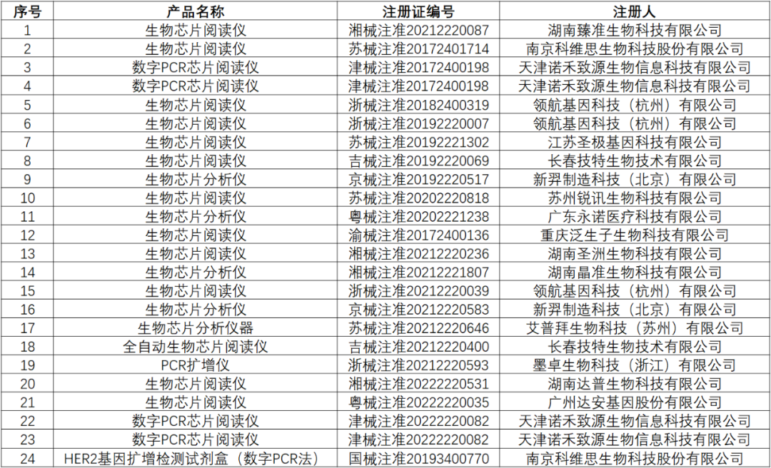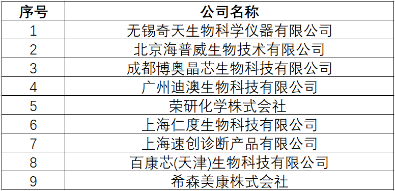 它是一种核酸分子绝对定量技术。相较于PCR,数字PCR能够直接数出DNA分子的个数,是对起始样品的绝对定量。数字PCR发展较PCR晚一些,截止到今天,共23款仪器获证,涉及16家公司,只有一款试剂盒获证,具体数据见表9。数字PCR领域,全部都是国产仪器(境外公司还没有直接入场)。