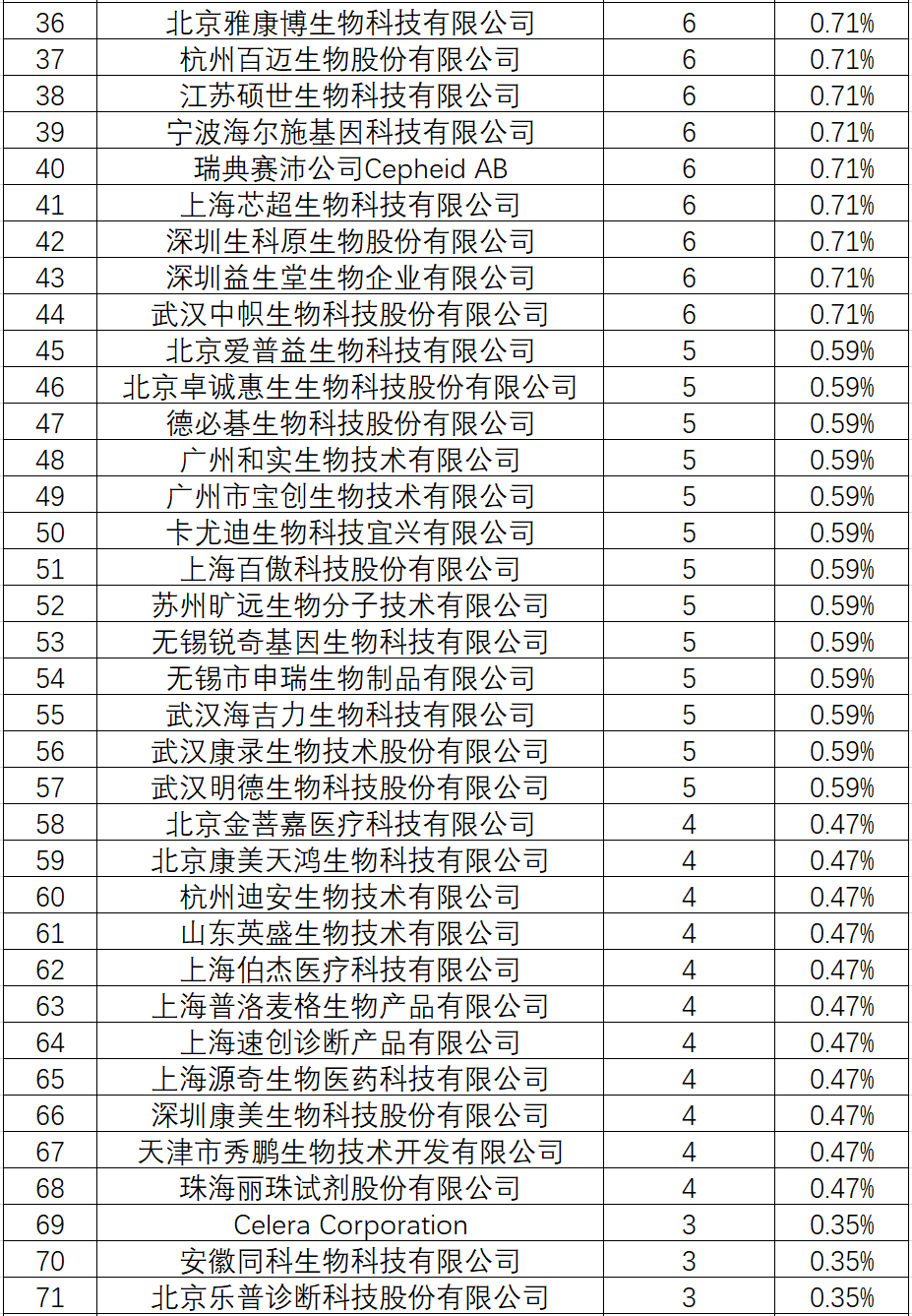 不同的公司根据自身情况有着不同的商业布局,有的只设计开发PCR试剂,有的公司只设计开发PCR仪器(开放性平台),而有的公司则是同时布局PCR试剂和PCR仪器,目前共有22家公司同时布局PCR试剂和PCR仪器,具体数据见表5。近年来随着IVD行业的快速发展,其他IVD细分领域(非核酸扩增领域)两手布局(试剂+仪器)的公司也在变多,后续在其他细分领域的分析报告中会阐述。
