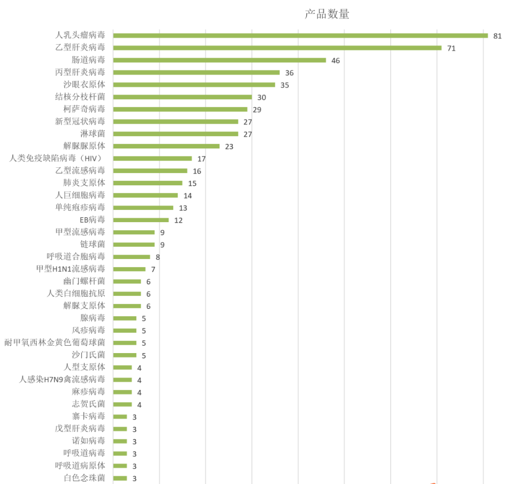 从图8可以看出,病原体检测相关试剂占总PCR试剂盒数量的69%(不包含新冠),这其中共涉及到75种致病性病原体,覆盖面很广,排名前三的分别是:HPV(81项)、HBV(71项)和肠道病毒(46项),具体数据见图10。