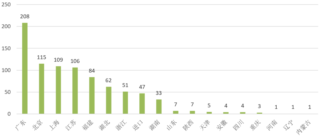 获证公司主要集中在经济发达省份,其中,浙江、江苏、福建、北京、广东是获批产品排前五名的省份(该处进口不排名),具体数据看图14。