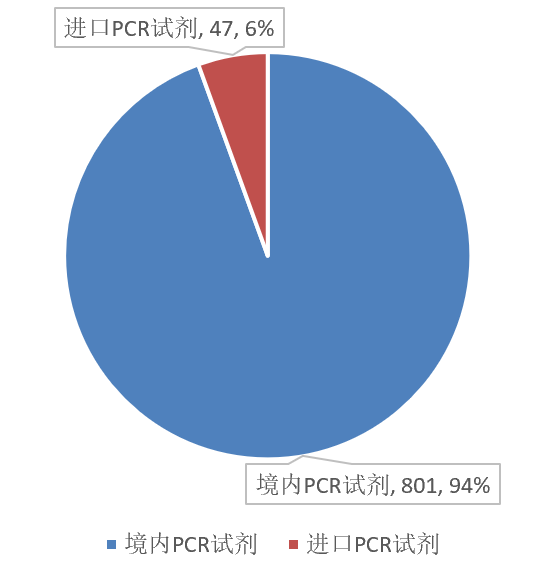 PCR技术为经典核酸扩增检测技术之一,NMPA共批准了848款PCR试剂盒,境内产品占主要,具体数据见图5,涉及168家公司,获证数靠前的5家公司为:达安基因(57款产品)、上海之江(35款产品)、泰普生物(25款产品)、艾康生物(24款产品)和百泰基因(23款产品),具体数据见表1。