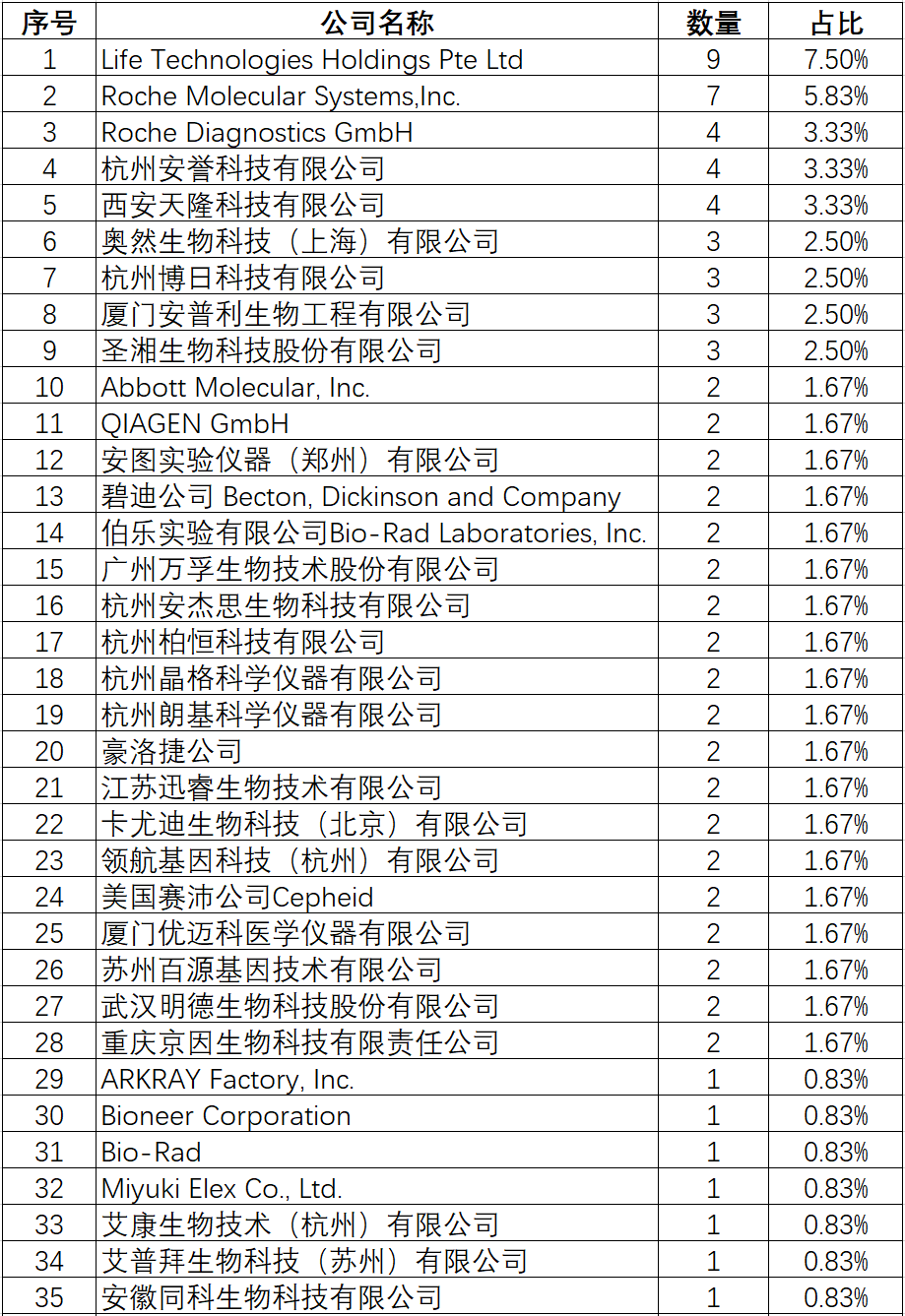 NMPA共批准了120款PCR仪器,进口产品占主要,具体数据见图11和表2,涉及70家公司,获证数靠前的5家公司为:Life Technologies Holdings Pte Ltd(9款产品)、Roche Molecular Systems,Inc. (7款产品)、Roche Diagnostics GmbH(4款产品)、杭州安誉(4款产品)和西安天隆(4款产品),具体数据见表3。