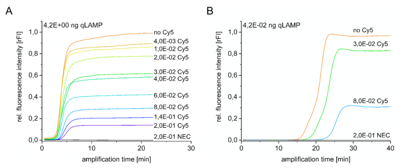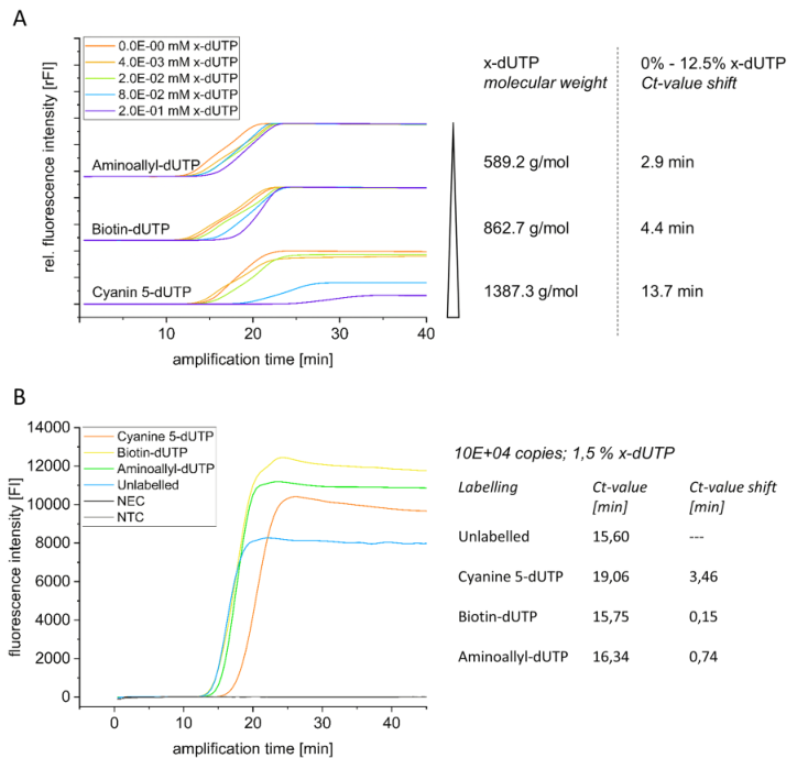 环介导等温扩增(LAMP)是最著名和最流行的等温扩增方法之一。它的简单性和速度使该方法特别适合于护理点诊断。然而,假阳性结果仍然是一个主要缺点。许多(下游)应用用于检测LAMP扩增子,如比色分析、原位LAMP或CRISPR Cas系统。通常,对于不同的检测应用,如横向流动分析,需要对LAMP产品进行修改。这通常是通过事先修饰引物实现的。 近日,来自德国的研究团队在Scientific reports上发表了一篇题为“Investigation and validation of labelling loop mediated isothermal amplification (LAMP) products with different nucleotide modifications for various downstream analysis”的文章,研究的目的是评估不同修饰核苷酸(如Cy5-dUTP、生物素-dUTP和aminoallyl-dUTP)的扩增子标记作为预标记引物的替代方案。研究团队研究了分子大小、核苷酸量以及靶浓度对扩增和标记效率的影响。这项研究表明,在LAMP过程中,使用不同的修饰核苷酸可以实现LAMP扩增子的不同标记,并且这些样品可以通过荧光光谱、凝胶电泳、微阵列和横向流动系统等广泛的下游应用进行分析。此外,研究团队还证明了基于微阵列的检测以及识别和区分假阳性的能力。 图片来源:Scientific reports LAMP背景及优劣势 2000年,Notomi等人开发了一种新的等温扩增技术,名为环介导等温扩增(LAMP)。二十多年后,LAMP属于最流行的等温放大技术。该方法基于一组多达6个引物和一个链置换聚合酶,能够高度敏感和特异地扩增少量目标DNA。结合逆转录酶,它也适用于RNA扩增(RT-LAMP)。到目前为止,在RT-LAMP、RIME-LAMP或DARQ-LAMP等多个变体版本中,可以找到超过千份使用该技术的出版物。自2019冠状病毒疾病大流行开始以来,已经发表了800多篇关于SARS-CoV-2检测的出版物。其中,大约有100个是用LAMP作为检测方法的。这不仅强调了LAMP对一般研究的重要性,也强调了它对当前全球重要问题的重要性。 与基于PCR的非等温方法相比,使用LAMP进行核酸扩增和检测具有许多优势。首先是放大速度。通过使用合适的引物组和最佳扩增条件,可以在不到30分钟的时间内检测到少量目标核酸,而PCR过程的扩增时间最多为3小时。此外,由于对能源和技术设备的需求减少,护理点设备中集成和使用LAMP是非常方便的。尽管LAMP有许多优点,但由于污染、序列相似性和引物二聚体引起的扩增假阳性是众所周知的LAMP缺点。 LAMP扩增产物的检测方法 LAMP与下游分析系统结合检测扩增产物的方法很广泛。包括标准凝胶电泳和定量扩增LAMP(qLAMP),通过不同的比色试剂(酚红、无色结晶紫、SYBR绿、孔雀石绿)进行横向流动分析(LFA)或与CRISPR-Cas系统的组合。最常用的是LFA和比色分析,但上述技术的主要局限性在于,它们不适合区分假阳性结果。基于微阵列的检测方法有助于克服这一障碍。 长度约为20–30 nt的特异性单链DNA探针固定在修饰表面上。扩增后,产物可以在这些探针上进行高度特异性杂交。通过选择合适的探针,不仅可以将扩增子与假阳性区分开来,甚至可以将其与单核苷酸多态性(SNPs)区分开来。 使用(半)定量分析系统(如qLAMP)和基于横向流动的方法需要标记用于目标检测的扩增子。到目前为止,使用预先标记的引物或探针一直是首选方法。这也导至了低灵活性和高成本、信号强度或放大效率调整不灵活性。或者,可以在扩增过程中使用预先标记的核苷酸进行靶向标记。这些类型的核苷酸具有不同的修饰,例如荧光团、生物素或氨基功能化,用于随后的定制标记。 灵活的LAMP标记方法 本研究旨在分析和评估所述基于直接和灵活的LAMP标记方法。此外,还证明了用3-Cy5-dUTP、生物素-dUTP和AA-dUTP标记LAMP扩增子的优缺点,代表了小、中、大尺寸的核苷酸修饰。 上述核苷酸修饰不仅具有不同的分子大小,而且在不同的分析和检测系统中也有用。Cy5-dUTP可用于用荧光团直接标记扩增子,用于多种荧光检测方法,结合生物素dUTP可在常用LFA中的链霉亲和素修饰表面上实现非共价固定。AA dUTP被认为允许加入一个功能基团,这可能有助于后续NHS分子的标记。 LAMP-dUTP标签策略及应用。 图片来源:Scientific reports x-dUTP掺入对LAMP效率的影响 为了确定在LAMP期间使用标记核苷酸对扩增效率的影响,使用不同量的SARS-CoV-2 cDNA和Cy5-dUTP以及生物素-dUTP和AA-dUTP稀释系列进行了基于SYBR绿色的定量环介导等温扩增(qLAMP)。每个反应的cDNA量为4.2E+00ng,Cy5-dUTP浓度范围为4.0E-03mM到2.0E-01mM,在不到5分钟的时间内检测到目标DNA。使用该量的靶DNA的反应效率只有轻微差异。然而,当使用较低数量的靶DNA时,已观察到扩增效率降低。 标记核苷酸对扩增效率的影响。 图片来源:Scientific reports 与未标记的核苷酸相比,Cy5-dUTP是一个相对较大的分子,因此研究团队研究了使用不同分子大小的各种dUTP标签对扩增效率的影响。对于AA-dUTP(589.2 g/mol)、生物素-dUTP(862.7 g/mol)和Cy5-dUTP(1387.3 g/mol),在以分子量表示的分子大小和所需的扩增时间之间发现了明显的相关性。未标记的参考样品的Ct值为15.6分钟。使用生物素dUTP和AA dUTP标记也会导至Ct值小于16.5分钟。使用Cy5 dUTP对扩增时间的影响最大,Ct值偏移为3.5分钟。 分子大小和浓度的影响。图片来源:Scientific reports Cy5-dUTP掺入和分析 通过Cy5-dUTP直接标记和AA-dUTP间接标记以及随后的NHS-Cy5标记,计算Cy5掺入LAMP扩增子的速率。LAMP扩增产物通过荧光光谱分析,记录在630nm激发下600 nm至800 nm范围内的发射光谱(图4A)。所有样品(Cy5稀释系