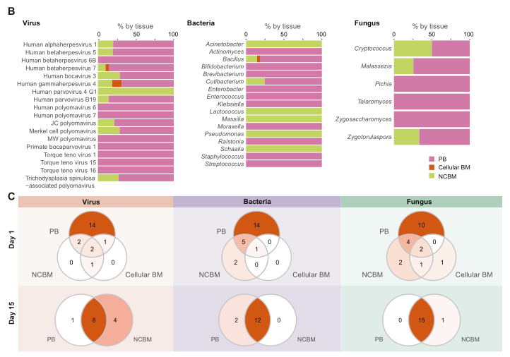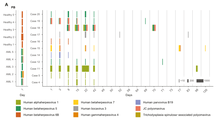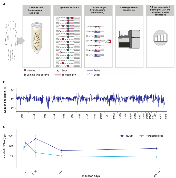 无细胞DNA(cfDNA)测序有望成为一种非侵入性诊断工具,用于评估母婴健康、早期检测癌症和监测治疗反应,以及以识别感染性微生物。急性淋巴母细胞白血病(ALL)是最常见的儿童癌症,尽管在过去50年中预后有显著改善,但仍然是儿童癌症相关发病率和死亡率的主要原因之一。此外,由于当前细胞毒性疗法的免疫抑制和骨髓抑制后果,感染性并发症仍然是治疗相关死亡率的主要原因。 几十年来,血浆中cfDNA的存在已为人们所知。根据DNA测序技术的进展,循环肿瘤DNA(ctDNA)目前正在被评估为恶性肿瘤症状前检测的生物标记物,以及监测反应和指导治疗的工具。迄今为止,大多数研究都是在实体瘤上进行的,其中ctDNA监测越来越显示出诊断和预后价值,有可能改善癌症患者的预后。无细胞RNA测序和核小体印迹显示,造血细胞是健康个体循环核酸库的最大来源,这表明与实体肿瘤相比,ctDNA监测在检测造血源性肿瘤方面可能更为敏感。 血浆中非人类DNA的鉴定和定量也显示出作为诊断传染病和监测人类病毒组的策略的前景。研究表明,微生物cfDNA(mcfDNA)测序能够更快速地检测稀有物种以及通过常规细胞培养方法难以检测的病原体。例如,最近发现,鸟枪式mcfDNA测序可以预测患有癌症的儿童患者即将发生的感染。mcfDNA测序敏感性的提高可以进一步确立微生物测序在诊断和预测感染性并发症方面的临床实用性。提高mcfDNA检测灵敏度的一种策略是丰富微生物特异性序列。 近日,一个以斯坦福为主的团队在 Science advances 杂志上发表了一篇题为“Simultaneous monitoring of disease and microbe dynamics through plasma DNA sequencing in pediatric patients with acute lymphoblastic leukemia”的文章。在本研究中,研究团队试图开发一种方法,同时监测ALL患儿的两个主要死亡原因:(i)疾病持续或复发;(ii)免疫抑制环境中的感染性微生物。为了实现这一点,研究团队开发并评估了一种新的基于捕获的超深测序策略,该策略在接受诱导化疗的ALL患者的血浆中富集了白血病特异性突变和潜在微生物。结果显示,这种方法可以检测和监测大多数患者的白血病,并确定在患者接受治疗时特定的ctDNA动态模式。此外,通过比较细胞与ctDNA变异等位基因组分(VAF),研究团队发现在诊断时进行侵入性骨髓检查以分离恶性细胞对于分析小的基因组变异可能是不必要的,因为在两种样本类型中检测到相似的变异频率相当。 图片来源:Science Advances 研究概述 在临床试验中,共有168份样本接受了测序,这些样本是从20名新诊断ALL患者中前瞻性收集的,他们接受了为期6周的诱导治疗。从外周血(PB)和骨髓中收集细胞和血浆(无细胞)组分,以便比较白血病相关突变和感染性微生物DNA的不同潜在储存库(图A)。panel覆盖率(图B)在目标序列上是均匀的,在12884次读取的平均深度上覆盖了100%的目标区域。 诊断时,平均血浆cfDNA产量与非细胞骨髓(NCBM)cfDNA产量相似(平均值分别为85 ng和75 ng)。在诱导化疗的前几天,血浆cfDNA产量增加,可能是由于开始治疗后白血病细胞迅速死亡所致。NCBM cfDNA产量在第15天达到峰值,这表明骨髓中的细胞仍然以比PB中的白血病细胞更高的速度和更晚的时间点死亡。此后,在整个诱导治疗过程中,cfDNA浓度保持在10 ng/ml左右,而在诱导治疗后期,NCBM cfDNA产量增加(图C),这可能反映了诱导治疗后再生造血细胞的更新。 工作流程、质量控制指标和cfDNA产量。 图片来源:Science Advances 诱导治疗期间VAF突变清除的患者动力学 在20名患者中,有17名患者(85%)在诊断时,ctDNA NGS识别出一种或多种变体(图A)。诱导化疗过程中的突变清除几乎是普遍观察到的。每个患者平均有2.3个可检测的突变(范围为0到5;标准差为1.3)。检测到39个独特突变,只有一个共享突变实例(病例3和16中的KRAS p.G13D)。当患者接受诱导化疗治疗时,观察到不同的变异等位基因清除模式。一般来说,在整个诱导治疗过程中,VAF都会先增加后减少(图B),这与化疗药物的药代动力学和细胞快速死亡一致。在这段时间内,这些基因座的覆盖率保持不变。16例患者中有8例(71%)发现的躯干突变(truncal mutations;定义为NCBM和PB中等位基因频率均大于0.25),包括NOTCH1、NRAS、KRAS、JAK2、NF1和ADGRL2基因。 患者队列中纵向清除率的变异。 图片来源:Science Advances 诱导期间观察到的微生物入侵 研究团队建立了同时检测细胞和cfDNA中病毒、细菌和真菌微生物物种的技术可行性。五名健康对照组和五名诊断为急性髓细胞白血病(AML)的患者的mcfDNA作为对照组。 结果显示,研究团队发现mcfDNA的变化是动态的(图B)。与健康对照样品相比,ALL患者中检测到的主要微生物种类发生了变化。例如,在所有健康样本中都检测到了Ralstonia菌属,但在126份ALL样本中仅一例检测到此菌属。相反,在大多数样本中均检测到Cutibacterium,但在健康对照组中均未检测到表皮细菌,这可能代表共生皮肤细菌入侵人类宿主的能力。在一部分患者中检测到已知的导至ALL患儿死亡的芽孢杆菌Bacillus。对于真菌DNA,60%的健康对照组和17个诊断性所有样本中的13个(82%)检测到Malassezia,但AML样本均未检测到。 诱导期内细胞骨髓、NCBM和PB中的微生物(病毒、细菌和真菌)丰度。图片来源:Science Advances ALL患者诱导治疗期间的动态病毒组 PB诱导治疗期间病毒种类检测的趋势表明,每个病例检测到的病毒种类具有可重复性(图A),并与健康对照组和五个年龄匹配的AML病例进行比较。所有