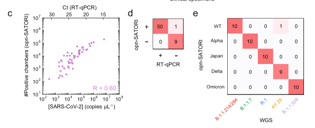 自2019年12月新型冠状病毒SARS-CoV-2传播以来,已经过去了两年多,但感染的发生率并未减少。从公共卫生的角度来看,对感染者进行早期诊断和隔离可有效防止感染的传播。快速、敏感和频繁的检测对于早期诊断很重要。对于SARS-CoV-2感染的诊断,逆转录定量聚合酶链反应(RT-qPCR)由于其高灵敏度(~ 2–20am,(1-10 copies/ul))已被用作“金标准”平台。此外,基于CRISPR的核酸检测方法,如SHERLOCK和DETECTR,由于其高灵敏度(~ 2–20am,(1-10 copies/ul)),相对较短的分析时间(几十分钟),并与紧凑的检测平台兼容亦引起关注。大多数基于CRISPR的方法涉及目标核酸的等温扩增,以及使用Cas12a或Cas13a对扩增的核酸进行荧光或比色读出。扩增步骤对于提高检测灵敏度是必不可少的,但它会延长检测时间(至少几十分钟)。 不久之前,研究团队将基于CRISPR的核酸检测和微反应室技术相结合,开发了一个称为SATORI(基于CRISPR的无扩增数字RNA检测)的无扩增RNA检测平台。SATORI可在5min内检测到单链RNA(ssRNA),如SARS-CoV-2 RNA,分析检测限(LoD)约为5fm(3X103 copies/ul),能够在大多数患者临床标本中快速诊断SARS-CoV-2 RNA感染。然而,当用于高效筛查时,LoD应<10 2copies/ul。此外,SATORI还包含几个手动处理步骤,这些步骤可能会导至人为错误并降低分析精度。 近日,为了解决这些问题,同一个研究团队在杂志Communications Biology 上发表了一篇题为“Automated amplification-free digital RNA detection platform for rapid and sensitive SARS-CoV-2 diagnosis”的文章,在文章中,研究团队开发了SATORI的全自动版本,称为SATORI自动化平台(opn-SATORI)。实验结果证明,opn-SATORI可以在临床标本中检测SARS-CoV-2 RNA,其灵敏度与RT-qPCR相当,并且可以在约9min内区分SARS-CoV-2变体,准确率为98%。 图片来源:Communications Biology 主要内容 “ 自动化平台的开发。 为了自动化SATORI检测流程,研究团队开发了一个RNA检测平台,该平台由三个主要组件组成:compact disk(CD)设备、荧光显微镜和机器人(图a)。基于CD的设备包含约10 8个圆柱形飞升级微反应室。与其他数字检测方法不同,opn-SATORI的CD设备不需要微流控通道中复杂的溶液交换过程,可以以全自动方式完成从样品混合到图像分析(图b)。开发的平台自动启用以下检测过程:(i)通过在试管中将含有预装Cas13a crRNA复合物和荧光猝灭基团标记的ssRNA reporters(FQ reporter)的酶溶液与含有crRNA互补ssRNA靶标(tgRNA)的样品溶液混合,制备反应溶液,(ii)将反应溶液滴入CD装置上的小室,(iii)用一滴油密封小室,(iv)积累来自Cas13a介导的FQ reporter裂解(反式裂解),(v)使用荧光显微镜从约500000个微反应室获取图像,以及(vi)计数荧光(阳性)小室的数量,以量化样本中的tgRNA拷贝数(图c)。整个过程可以自动重复,并且可以使用单个反应分析48个样本。 无扩增数字RNA检测的自动化平台。 图片来源:Communications Biology “ Cas13a的筛选。 为了提高检测灵敏度,研究团队筛选了Cas13a同源序列并优化了缓冲条件。LwaCas13a和LbuCas13a因其强大的反式切割活性而被用于基于CRISPR的核酸检测。此外,LtrCas13a与LwaCas13a和LbuCas13a高度同源,并与LwaCas13a具有类似的抑制细菌生长的作用。结果表明,使用LtrCas13a及Ltr缓冲液时,阳性小室数量最多,且随着tgRNA浓度(300aM–300fM)增高,Ltr缓冲液中阳性小室的数量呈线性增加。在试验开始后约7分钟(油封后3分钟),LtrCas13a检测到SARS-CoV-2的N基因RNA和全基因组RNA,LoD值分别为220和280 aM(1.3×102和1.7×102copies/ul)。鉴于所获得的快速、灵敏和稳健的反式切割活性,LTRCA13A和Ltr缓冲液的组合最适合用于此RNA检测平台。 “ 提高病毒RNA检测灵敏度。 由于平台检测总体积约为15 nL(500000×~30fL)的微室阵列中随机捕获的tgRNA分子,超过99%的tgRNA分子在油封过程中被丢弃,从而导至灵敏度降低。为了克服这一缺点并进一步提高灵敏度,研究团队使用生物素-链霉亲和素磁珠技术在微腔内富集tgRNA分子。将包被链霉亲和素的磁珠添加到含有生物素标记的LtrCas13a crRNA复合物、tgRNAs和FQ reporter的反应溶液中,以捕获磁珠上的LtrCas13a-crRNA -tgRNA复合物,随后将混合物滴到CD设备上,通过磁力将复合物浓缩到腔室中,并用油密封腔室(图a)。该程序在5min内自动完成,与未经磁珠处理的程序相比,阳性小室的数量增加了约50倍(图b),表明LtrCas13a-crRNA-tgRNA复合物在微室中成功富集。在试验开始后约9分钟(油封后3分钟),平台检测到SARS-CoV-2的N基因RNA和全基因组RNA,LoD值分别为2.4和6.5aM(1.4和3.9 copies/ul)(图d)。 Opn-SATORI平台。 图片来源:Communications Biology “ SARS-CoV-2变异毒株的鉴别。 研究团队试图使用opn-SATORI来区分SARS-CoV-2变体。针对相应的变异毒株,即B.1.1.7(α)、B.1.351(β)和B.1.617(δ)中的N501Y、E484K和L452Rspike突变,各设计了20个crRNA,并进行比较筛选。结果显示,在试验开始后约9分钟内(油封后3分钟),WT SARS-CoV-2与每个变体之间的比率存在显著差异,从而能够快速准确地识别SARS-CoV-2变体。不仅如此,B.1.1.529(ο)变体也可以准确区分。总之,这些结果表明,使用opn SATORI和针对特定突变的适当crRNA对可以检测新出现的SARS-CoV-2变体。 SARS-CoV-2变异株的鉴别。 图片来源:Communications Biology “ 临床验证。 研究团队验证了opn-SATORI是否可用于诊断SARS-CoV-2感染。使用靶向N基因RNA的crRNA,研究团队评估了来自Ct值为15–30(10 WT、10 alpha、10 Japan、10 delta和10 omicron变体)患者的50份人类鼻咽拭子衍生RNA样本和来自健康人的10份RNA样本。样品的阳性室数与RT-qPC