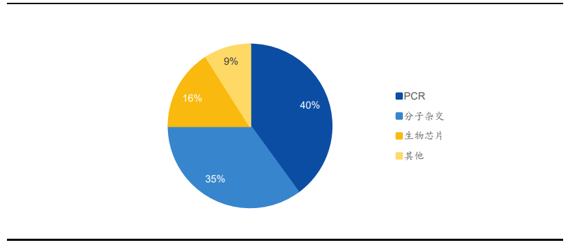 图1.国内分子诊断不同技术市场份额与分子杂交和测序技术相比,PCR 技术主要优势在于高灵敏度、易于推广,主要局限在于检测位点单一且已知,多重基因联合检测时可涵盖的基因数量受限,目前已经发展到第三代数字PCR(dPCR),短期内仍将是分子诊断主流技术平台;测序技术发展迅猛,虽然市占率较低但市场增速最快,其中二代测序技术 NGS (高通量测序)是目前测序领域应用最广泛的技术,已经成为许多序列变异分析与科研应用的主要选择,但由于实验操作复杂、成本高等原因,在临床应用中仍处于起步阶段,应用前景广阔。