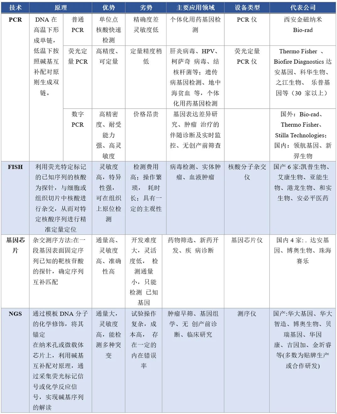 图3.分子诊断各细分技术优缺点和主要应用领域