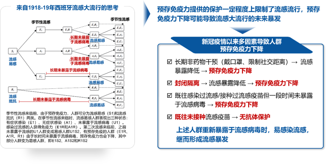 大家对流感的认知是否还停留在2020年,认为流感仍处于低流行水平?实际上并非如此,流感已逐渐恢复“元气”,重新回归到新冠肺炎疫情发生之前的季节性流感流行状态。今年流感疫情形势如何?且看6.11日落幕由中华预防医学会主办的“2022季节性流感防控策略学术交流会”上,来自中国疾控中心专家的解读。最新流感监测报告显示,今年流感活动较上一年有所上升。全球范围内,2022年2月以来,流感活动水平有所增加,3月出现流感流行的高峰,以A(H3N2)亚型为主(图1)。我国南方省份近期流感样病例呈快速上升趋势,尤其是近两周流感样病例已超过前3年的同期,以近98%的A(H3N2)亚型为绝对优势(图2),并引起多起聚集性暴发疫情,主要以中、小学为主。这些数据提示我们新冠肺炎疫情下需重视流感防控。图2 2022年南/北方省份流感样病例标本季节性流感病毒检测结果全球多地区出现新冠、流感共同流行的情况,尤以东南亚地区为典型(图3)。一项几乎汇总了全球所有流感和新冠共感染数据的Meta分析也证实,流感和新冠共感染是存在的,虽然这一比例相对较低,值得关注的是儿童共感染比例要显著高于成年患者,而一旦儿童合并感染可能会导至更严重的结局。这也意味着我们今年仍然面临新冠与流感共同感染的风险,需要加强联防联控。 新冠肺炎疫情发生以来,长期佩戴口罩、限制社交距离等非药物干预措施虽然一定程度上减少了流感病毒传播,使得人群感染流感的机会减少,但也会造成人群对流感的预存免疫力下降,流感易感性增加。我国流感疫苗接种率极低,整体人群接种率不足5%。在这种情况下,一旦进入秋冬流感季,人群重新暴露于流感病毒时易感染流感,将大大增加流感暴发的风险(图4)。图4 新冠肺炎疫情下人群预存免疫力和流感暴发的关系事实上,新冠肺炎疫情发生前,流感的疾病负担就已非常严重(图5和图6)。流感通过呼吸道及接触即可传播,全人群普遍易感。全球每年季节性流感感染人数高达10亿,约平均每7人就有1人遭流感侵袭,其中儿童、医务人员等高危人群感染率更高。流感对中枢神经、心血管、呼吸及泌尿四大系统都可能产生严重并发症,使得肺炎、急性心梗、脑卒中、肾脏并发症等高致死疾病的发病率呈几倍到100倍地增加。据WHO估计,每年因流感死亡的人数高达65万,相当于每49秒就有一人死于流感。这些数据再次提醒我们流感的致命性威胁不容小觑。新冠与流感的交叉流行还会带来叠加效应负担。据报告,流感病毒可在新冠重症患者中诱发较早、较严重的细胞因子风暴,导至休克、急性呼吸窘迫综合征、暴发性心肌炎、急性肾损伤或多器官功能衰竭等严重并发症。最新研究表明,同时感染流感和新冠的患者需要呼吸机治疗的风险是单独感染新冠患者的4.14倍,死亡风险是单独感染新冠患者的2.35倍。这意味着一旦合并感染流感和新冠将增加重症和死亡风险。三、中国疾控专家提醒:尽早接种流感疫苗,未雨绸缪2022流感季当前的流感监测数据和流感预测模型都提示今年秋冬季可能面临流感暴发风险,一旦同时感染新冠与流感,危害可能会很大。为此,中国疾控专家建议,在今年疫苗可及的情况下,尽早接种流感疫苗,以更好地应对秋冬不确定的流感形势,最大程度保护自己、保护家人。