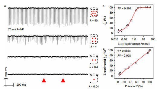 研究团队首先评估了DIAMOND对单个NP的检测能力。75 nm 金纳米颗粒悬浮液通过注射泵以6μL/min的流速注入200μm毛细管。图a中突出显示的每个PNB信号表示根据泊松分布检测到的单个AuNP。这一结果证实了DIAMOND对单个NP的检测能力,且DIAMOND是一种无校准技术,允许绝对量化。