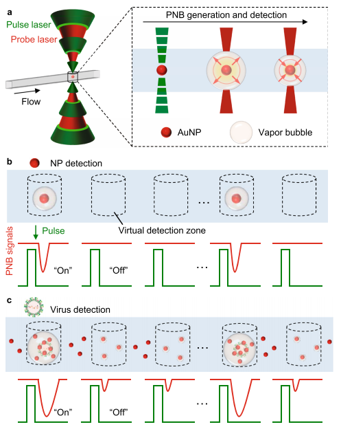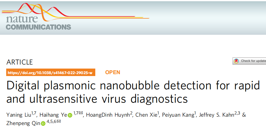 近日,来自美国的研究团队在杂志Nature communications上发表了一篇题为“Digital plasmonic nanobubble detection for rapid and ultrasensitive virus diagnostics”的文章。在这篇文章中,研究团队报告了一种基于数字等离子体纳米气泡检测(DIAMOND)的策略来对病毒进行快速敏感诊断的方法。等离子体纳米气泡是激光加热等离子体纳米颗粒(NPs)产生的瞬态蒸汽气泡,允许单个NP检测。使用金纳米颗粒作为标签和光流控装置,研究团队证明了DIAMOND实现了无隔室数字计数,并在无分离和扩增步骤的均质免疫分析中发挥作用。DIAMOND可以特异性检测鼻拭子样本中的呼吸道合胞病毒,检测限约为100 PFU/mL(相当于1个RNA拷贝/μL),与用于病毒检测的数字等温扩增相近似。因此,DIAMOND具有一步、单NP检测、室温下直接检测完整病毒、无复杂液体处理等优点,是一种快速、超灵敏诊断的平台技术。