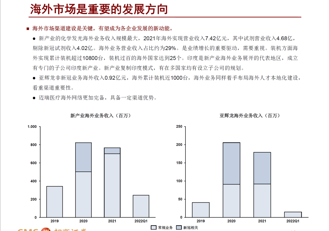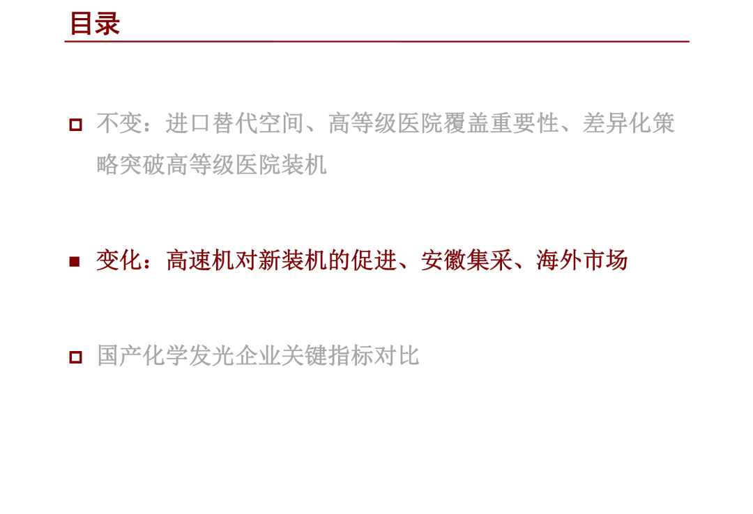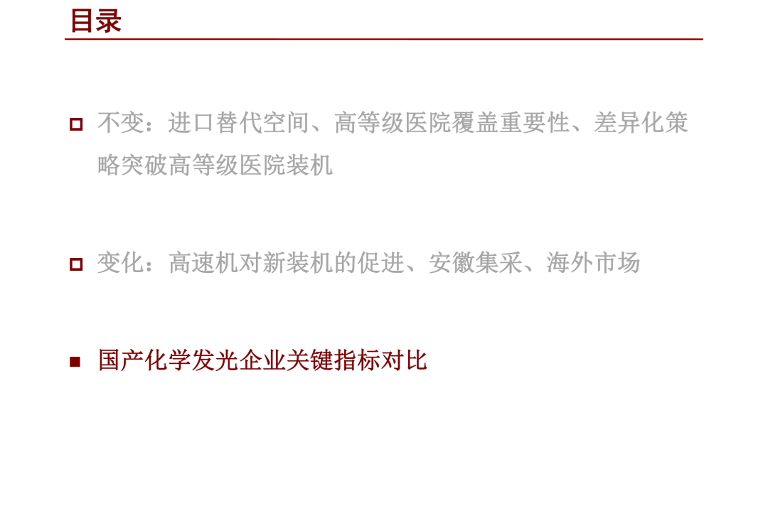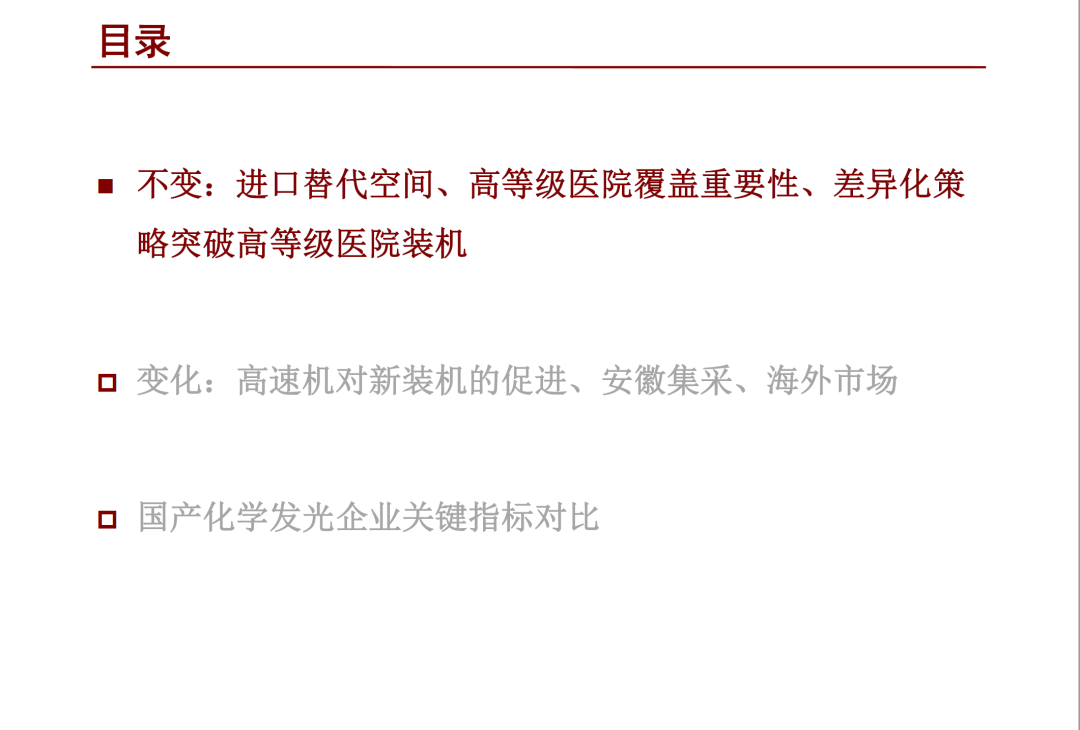 本文内容来源于招商证券,内容供参考,不作为投资指导。 在两年时间内在两年时间内,行业本身经历了如: 1)新冠疫情 2)安徽化学发光集中采购等重大事件的变化影响,同时也衍生驱动业绩增长的新因素; 在行业近两年的发展过程中,我们也注意到行业逻辑中不断被验证的不变的部分。 1 Part.1 不变 ⭐国内市场国产市占率仍不足国内市场国产市占率仍不足25%,进口替代空间仍然很大 ⭐高等级医院占比与单机单产可以形成映射占比与单机单产可以形成映射。 ⭐差异化策略突围差异化策略突围,通过特色项目可装机进入高等级医院通过特色项目可装机进入高等级医院 2 Part.2 变化 ⭐高速机型对新装机起到重要带动作用高速机型对新装机起到重要带动作用。。 ⭐“安徽集采安徽集采””目前看对国产企业机会大于利空目前看对国产企业机会大于利空。。 ⭐需要重视部分企业海外市场的业绩增长需要重视部分企业海外市场的业绩增长 具体内容详见下方PPT资料 |