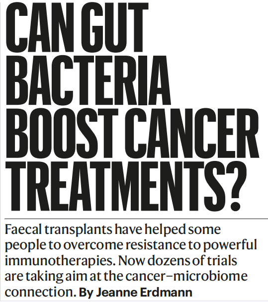 近日,在顶刊Nature杂志上发表了一篇题为“Can gut bacteria boost cancer treatments?”的文章,文章讲述了粪便移植的理念和开创性临床试验,并且梳理了粪便移植的发展过程和正在进行的临床试验,可能遇到的困难以及发展方向。粪便移植帮助一些人克服了对强大免疫疗法的抵抗,现在有数十项试验针对癌症与微生物组的联系。