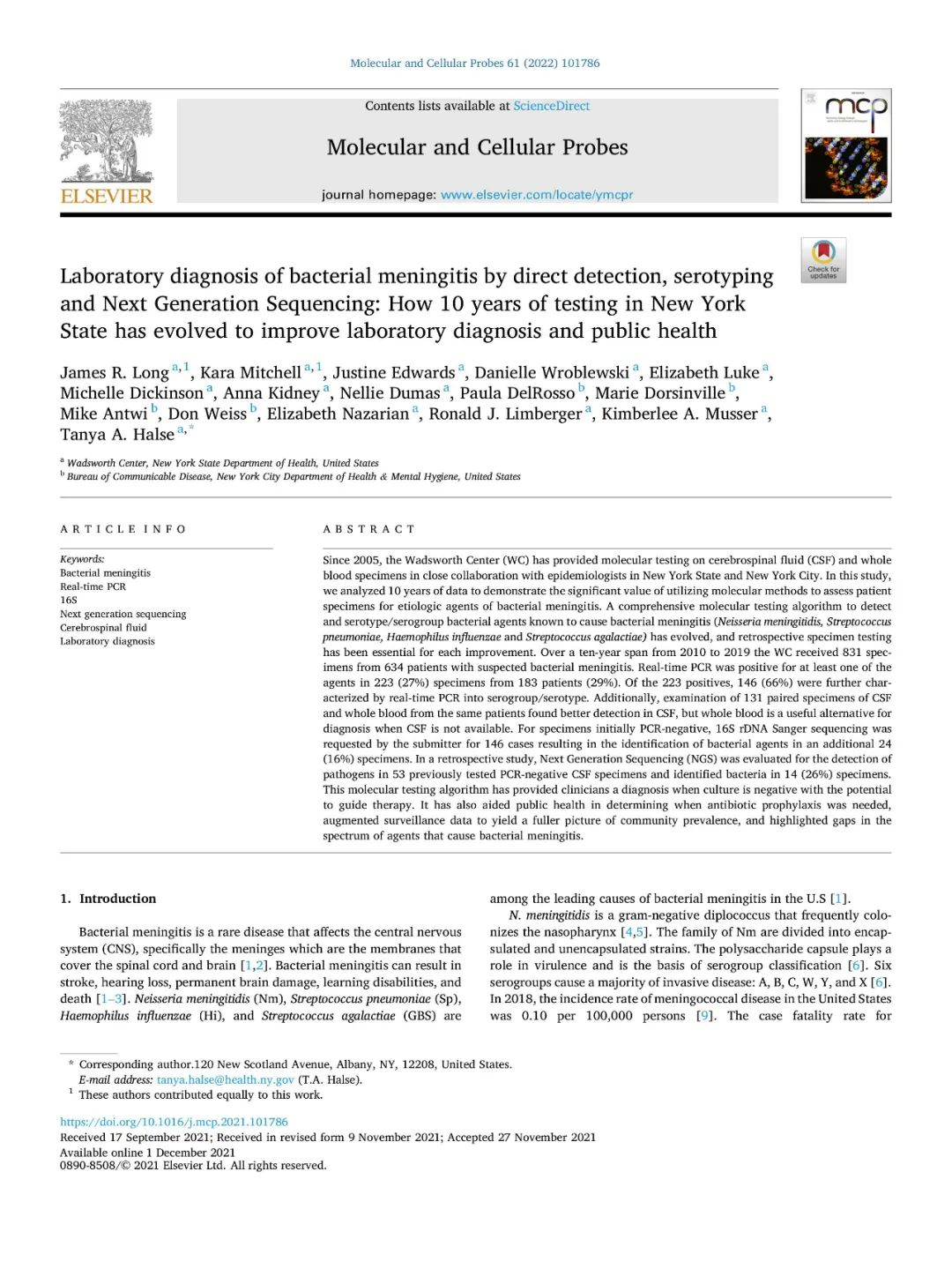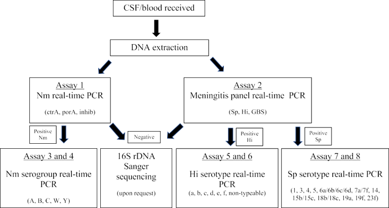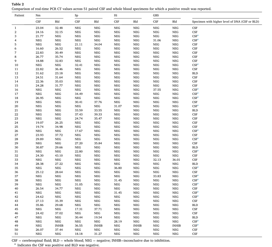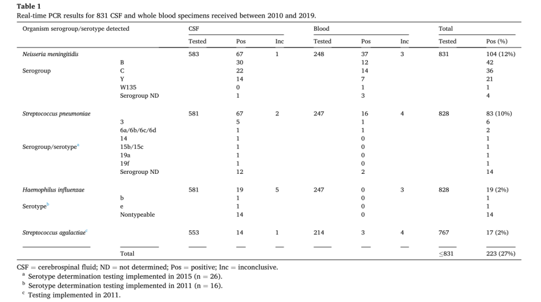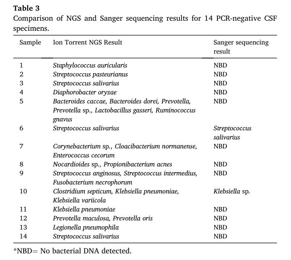 编译:迪丽努尔·迪力穆拉提/ 审核:陈云波 前言 细菌性脑膜炎是一种影响中枢神经系统的少见疾病,可导至中风、耳聋、永久性脑损伤、学习障碍和死亡。在美国,脑膜炎奈瑟菌、肺炎链球菌、流感嗜血杆菌和无乳链球菌是导至细菌性脑膜炎的主要病原菌。细菌性脑膜炎的实验室诊断仍然依赖于病原体培养、脑脊液分析(包括细胞计数、革兰染色、生化分析)以及抗原检测。以往的研究表明,革兰染色具有较高的特异性,但敏感性较低;在抗原检测中也会因其他链球菌种类而导至假阳性结果。而对于在标本采集前已经验性使用抗菌药物治疗的患者,实时荧光PCR是一个不错的选择,并且可以在数小时内提供结果。 这篇研究中,作者通过实验室研发的多重PCR技术,同时检测脑膜炎奈瑟菌、肺炎链球菌、流感嗜血杆菌和无乳链球菌,降低了试剂的成本并保留了临床标本的数量。 研究方法 1.样本采集: 2010年1月1日至2019年12月31日,纽约州疑似患有细菌性脑膜炎的患者的全血脑/脊液临床标本。 作者同时利用宏基因二代测序对68例标本进行分析:包括15个已知的脑膜炎奈瑟菌、肺炎链球菌和流感嗜血杆菌阳性标本,包括弱阳性(实时荧光PCR周期阈值(CT)≥30)和强阳性(CT值<30),以及53个实时荧光PCR阴性且未进行额外检测的标本。同时,对同一组样本进行了16S rDNA测序鉴定。 2.分子检测技术及流程 当收到脑脊液/全血标本后,对其进行DNA提取,可同步进行两个检测,检测1是为了检测脑膜炎奈瑟菌,检测2主要是为了检测肺炎链球菌、流感嗜血杆菌和无乳链球菌。如果脑膜炎奈瑟菌、肺炎链球菌、流感嗜血杆菌的检测结果呈阳性,则进行血清分型/血清分组检测。脑膜炎奈瑟菌的目标血清群是A、B、C、W和Y,而流感嗜血杆菌的目标是血清型a至f。肺炎链球菌的目标血清型1、3、4、5、6a-6d、7a/7f、14、15b/15c、18b/18c、19a、19f、23f。具体流程如图所示,详细可见全文。 图1. 细菌性脑膜炎分子检测算法流程 研究结果 1.实时荧光PCR总结:在10年期间,对634名患者的831份全血和/或脑脊液标本进行了检测(表1)。在183名患者(29%)的223份(27%)标本中通过实时荧光PCR检测到细菌DNA;13%(104例)被确认为脑膜炎奈瑟菌,10%(83例)被确认为肺炎链球菌,2%(19例)被确认为流感嗜血杆菌,还有2%(17例)被确认为无乳链球菌。 表1:2010至2019年间收到的831份脑脊液和全血标本的实时荧光PCR结果 2. 脑脊液和全血标本CT值(实时荧光PCR周期阈值)的比较:131名患者在同一天或24小时内采集了脑脊液和全血标本,并在检测1和检测2中同时检测脑膜炎奈瑟菌、肺炎链球菌、流感嗜血杆菌和无乳链球菌。选取的51份标本分别为脑膜炎奈瑟菌(27)、肺炎链球菌(15)、流感嗜血杆菌(5)或无乳链球菌(4)是阳性,其中33份标本同时脑脊液和全血呈阳性,18份标本仅在CSF标本中检测到DNA。本文比较了51个配对阳性标本的平均CT值(表2),发现45个(88%)标本的CT值在脑脊液中较低(或在血液为阴性的情况下为阳性),表明脑脊液中可检测到的脑膜炎奈瑟菌的 DNA比全血标本中多。 表2:比较51个配对的阳性脑脊液和全血标本的实时荧光PCR CT值 3.16S rDNA测序结果:根据要求,对146份实时荧光PCR阴性标本进行了16S rDNA Sanger测序,其中24份(16%)检测出了细菌DNA, 在其他122份标本中没有检测到细菌DNA,表明没有细菌存在或细菌水平低于16S检测的水平。 4.二代测序结果:在这项回顾性研究中,使用Ion Torrent NGS系统共检测了68份脑脊液标本。NGS在15个阳性标本中正确鉴定了脑膜炎奈瑟菌(6)、肺炎链球菌(6)和流感嗜血杆菌(3),并在53个阴性标本中的鉴定了另外14个(26%)细菌(表3)。 表3:14份PCR阴性CSF标本的NGS和Sanger测序结果的比较 BRICS 编者按:迅速诊断细菌性脑膜炎对于患者治疗至关重要。因此,不断改进检测和识别感染性病原体的方法是很重要的。本文分析了实时荧光PCR结果、16S rDNA测序结果和NGS数据,针对主要是培养阴性的疑似细菌性脑膜炎的临床标本。虽然实时荧光PCR比培养细菌更昂贵,但它能提供更敏感更迅速的检测结果,并能为培养阴性的标本提供诊断。多重实时荧光PCR的一个优势是可对其他标本类型进行验证,如关节液、胸腔液等。虽然实时荧光PCR时间较短,而且比NGS便宜,但它的识别能力受到目标基因数量的限制,而16S rDNA测序和 NGS都可以识别细菌,并有可能识别以前未知的病原体,本文结果显示16S rDNA测序和NGS在实时荧光PCR阴性的标本中发现了微生物病原体。在细菌性脑膜炎诊断时,CSF被认为是首选的标本类型,但在CSF量不足、无法获得或怀疑菌血症的情况下,也应检测外周血。分子检测技术可以在培养阴性的标本中改进,进一步检测细菌血清群和血清型,可以为疾病诊疗和或相关疫苗提供信息。 原文:点击下方“阅读原文”阅读全文 |