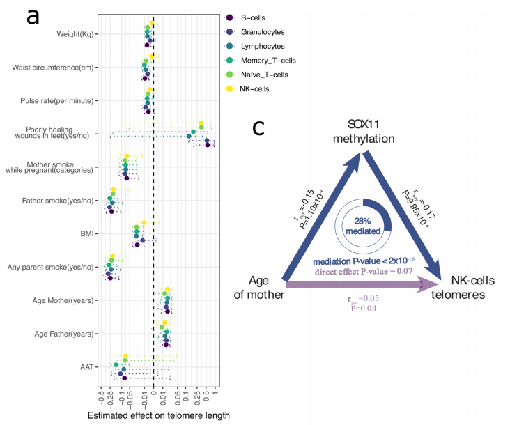 一些研究报告了父母年龄和吸烟对孩子“甲基化年龄”的影响。因此还研究了亲本表型对端粒长度的影响是否可以通过甲基化水平的变化来介导。结果显示,与父系年龄效应相比,母系年龄效应更可能是通过甲基化介导。