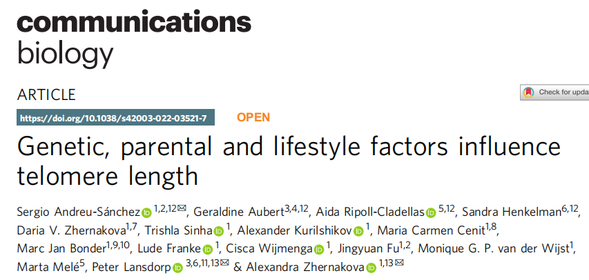 近日,来自世界各地,包括荷兰、加拿大、俄罗斯、德国等地的研究团队在杂志Communications biology上发表了一篇题为“Genetic, parental and lifestyle factors influence telomere length”的文章。在文章中,研究团队使用Flow-FISH端粒长度测量法在Lifelines Deep(LLD)人群中探索端粒变异。研究团队在1046名参与者中测量了六种不同细胞类型的端粒长度。通过将这些数据与LLD参与者可用的遗传信息以及丰富的表型信息相结合,包括62名个体的血细胞计数和免疫标记物、自我报告的疾病、出生相关表型、父母疾病和行为、表观基因组学特征和单细胞表达模式,确定了端粒长度变化的主要贡献者。具体来说,研究包括了(1)六种血细胞类型端粒长度的差异,(2)白细胞端粒长度与其他衰老标记物之间的关系,(3)端粒衰老标记物与生化、亲代和临床表型及死亡率的相关性,(4)遗传和非遗传因素对端粒长度变化的贡献;(5)与特异性端粒长度变异相关的基因表达变化,这可能精确定位与端粒变异相关的主要功能途径。
