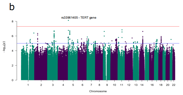 位于端粒酶逆转录酶(TERT)基因内含子中的rs33961405的A等位基因与T细胞端粒长度减少有关。