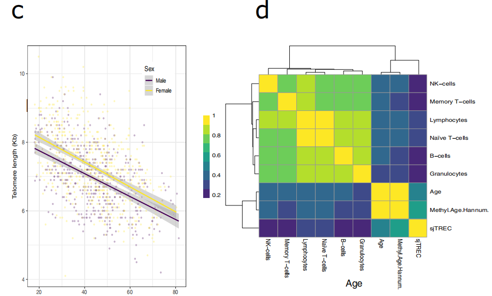 接下来将端粒长度与其他生物年龄标记物进行比较,包括基于甲基化的Hannum年龄指数和sjTRECs表达,其代表了给定个体的胸腺TCR成熟,结果显示,甲基化年龄和sjTREC与年龄的关系比端粒长度的关系更密切,两者都不与端粒长度高度相关。总的来说,这些发现表明端粒长度捕捉了除年龄以外的生物学变化,并且与其他衰老标记物相比,这种变化的来源是不同的,特别是甲基化年龄和胸腺功能。