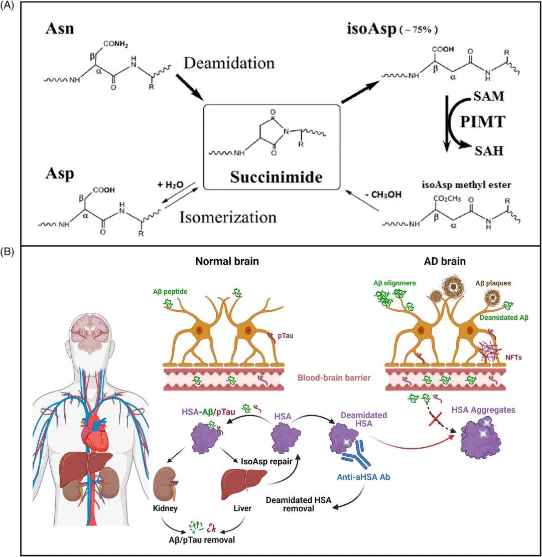一个国际研究小组发现了一种通过血液分析诊断阿尔茨海默病的新方法,有可能揭示该疾病的潜在原因并阻止其发展。 卡罗林斯卡学院8月5日消息 由卡罗林斯卡学院(Karolinska institute,KI)的一个研究小组领导的一个国际研究团队,利用蛋白质组学和其他先进的分子生物学工具,发现了一种通过血液分析诊断阿尔茨海默病的新方法,有可能揭示这种疾病的潜在病因,并阻止其发展。这项研究发表在《阿尔茨海默病与失智症》(Alzheimer's & Dementia)杂志上。 研究于2022年8月4日发表在《Alzheimer's & Dementia》(最新影响因子:16.655)杂志上 当我们变老时,我们体内的蛋白质也会变老,包括血液中的长寿蛋白质,比如白蛋白。蛋白质老化的主要表现之一是氨的损失,称为脱酰胺(Deamidation)。随着脱酰胺产物的积累,蛋白质分子失去其结构、功能和溶解性,并开始聚集。