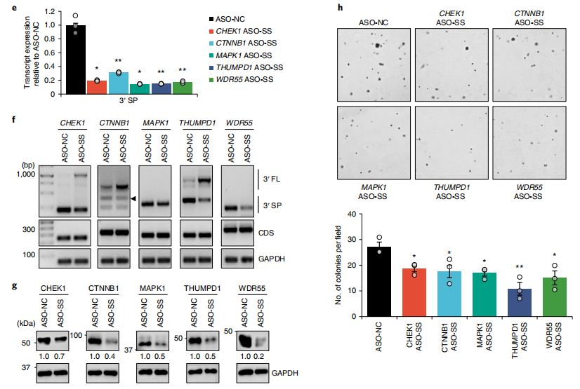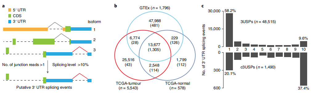 信使RNA(mRNA)包括蛋白质编码区,两侧为5′和3′非翻译区(UTR),在转录后调节中起重要作用。UTR包含许多调控序列和结构,例如AU富含元件、G富含元件和microRNA响应元件,RNA结合蛋白(RBP)和microRNAs通过这些元件调节mRNA代谢。这包括mRNA定位、稳定性和输出等过程,这些过程受到严格控制,以确保在生理条件下正确的基因表达和功能。 大多数哺乳动物基因通过各种机制产生可变3′UTR,包括可变多聚腺苷酸化(APA)和可变剪接。除了关键的生理功能外,对各种疾病状态下3′UTR突变和其他结构变异的频繁观察表明,3′UTR可能在发病机制中发挥关键作用。例如,破坏PD-L1的3′UTR的结构导至其过度表达和抗肿瘤免疫逃避。在癌症中,对可变3′UTR的研究几乎完全集中于APA衍生的较短3′UTR。重要的是,研究表明,APA导至的3′UTR缩短破坏了microRNA结合和相关的竞争性内源性RNA网络,其中转录物竞争共享的microRNA,导至癌症中关键癌基因和肿瘤抑制因子的异常表达。此外,这些缩短的3′UTR可以差异调节蛋白质功能、定位和蛋白质-蛋白质相互作用,从而赋予癌细胞致癌优势。 超过95%的人类基因经历可变剪接以显著增加转录组和蛋白质组的多样性。最近的大规模转录组学分析显示癌症中存在高频率的异常剪接。尽管数据库中对3′UTR剪接事件(3USPs)进行了注释,但迄今为止,只有少数剪接事件被表征,因为绝大多数剪接研究集中在mRNA的蛋白质编码区。 近日,来自世界各地包括新加坡、沙特阿拉伯、马来西亚、泰国、美国、加拿大等地的研究团队在杂志Nature cell biology上发表了一篇题为“Pan-cancer pervasive upregulation of 3′ UTR splicing drives tumourigenesis”的学术文章。在文章中,发现3′UTR剪接广泛存在,在癌症中上调,与不良预后相关,在癌基因中更为普遍。同时还证明了关键癌基因CTNNB1的剪接3′UTR的生理、功能和临床相关性。研究团队验证了其在肝细胞癌和结肠癌中的上调,并表明剪接的3′UTR变体是其致癌功能的主要贡献者。总之,这项研究强调了3′UTR剪接在癌症中的重要性,并可能为基于RNA的抗癌治疗开辟新途径。 图片来源:Nature cell biology 主要 内容 一 3′UTR剪接广泛存在 使用特异性位于3′UTR内的剪接连接点,研究团队从癌症基因组图谱(TCGA)的十种癌症类型和的相应组织(GTEx)中鉴定并量化了7917个RNA测序(RNA-seq)样本中的3USP。总的来说,从TCGA肿瘤及其邻近的正常样本(TCGA肿瘤和TCGA正常)中鉴定出45815和18253个3USP,而在GTEx的健康组织中鉴定出68668个事件。 对于每种癌症和组织类型,研究团队将常见的3USPs(c3USPs)定义为在超过一半的样本中检测到的事件。与3USP相比,不同数据集、癌症和组织类型中确定的c3USP总数更加一致。此外,C3USP在TCGA和GTEx数据之间具有高度可重复性,大多数在不同癌症和组织中普遍检测到。经分析,对比GENCODE注释和已发布的TCGASpliceSeq,其中约20%的C3USP是未注释的,且它们可能具有生物学功能。 转录组分析揭示了广泛的3′UTR剪接。图片来源:Nature cell biology 二 3′UTR剪接在癌症中上调。 为了确定在癌症中失调的3′UTR剪接,研究团队比较了肿瘤中每个c3USP的剪接水平(SPL)与每个TCGA癌症相邻正常样本和相应GTEx正常组织中的值。总共,1490例c3USP中有671例在至少一种癌症类型中显示出显著差异。所分析的十种癌症类型中有八种的c3USP上调比下调更显著。 接下来,研究了每种c3USP的SPL与每种实体瘤类型的总患者生存率(OS)之间的相关性。根据临床结果定义了两种与预后相关的c3USP:不利事件和有利事件,分别为SPL越高,OS越差和越好。不利事件和有利事件的比率在不同癌症类型中有所不同。研究团队将它们与不同癌症中显著失调的c3USP重叠,发现上调的c3USP明显更不利, 其中90个被确定为不利的预后标志物。总之,这些结果表明3′UTR剪接在癌症中优先上调,并可能与癌症结局相关。 3′UTR剪接在癌症中上调。图片来源:Nature cell biology 三 靶向抑制3′UTR剪接可阻止肝癌发生。 在所研究的十种癌症类型中,TCGA-LIHC (TCGA-liver HCC) 样本的3USP数量显著高于其相邻的正常样本。大量3USP与较差的OS显著相关。在31个显著上调事件中,研究团队选择了未注释为NMD靶标的前5名候选靶标(CTNNB1、CHEK1、MAPK1、THUMPD1和WDR55)用于进一步的实验验证。 研究团队设计了反义寡核苷酸(ASOs)来阻断3′UTR剪接位点。这些ASO显著降低了各自的3′SP表达,同时增加了CHEK1、CTNNB1和THUMPD1的未切片全长转录本(3′FL)。这些效应伴随着相应蛋白表达的降低和肿瘤生长的抑制,可能是由于细胞周期抑制,如细胞周期基因(包括CCNE1、CDK2、CDK4和CDK6)表达下调所示。因此,这些ASO可以特异性地抑制3′UTR剪接,这可能在调节癌基因的蛋白表达和致瘤功能中起重要作用。 靶向抑制3′UTR剪接可阻止肝癌的发生。图片来源:Nature cell biology 四 四、CTNNB1的3′UTR剪接促进肿瘤发生。 研究团队进一步检查了HCC中最普遍失调的c3USP,CTNNB1 3′SP,发现cTNNB3′UTR的过度剪接与较差的OS显著相关。与其在患者体内的表达一致,在HCC细胞系Hep3B和SNU398中,CTNNB1 3′SP上调。 为了研究CTNNB1 3′UTR剪接的功能效应,研究团队使用siRNA,专门针对CDS、3′FL的内含子和3′SP的独特剪接连接点。结果显示,与3′FL敲低相比,3′SP缺失显著降低了CTNNB1 CDS转录本和蛋白表达,表明CTNNB1蛋白主要由3′SP转录本表达。也同样观察到si-CDS和si-3′SP介导的细胞生长和迁移减少,以及小鼠异种