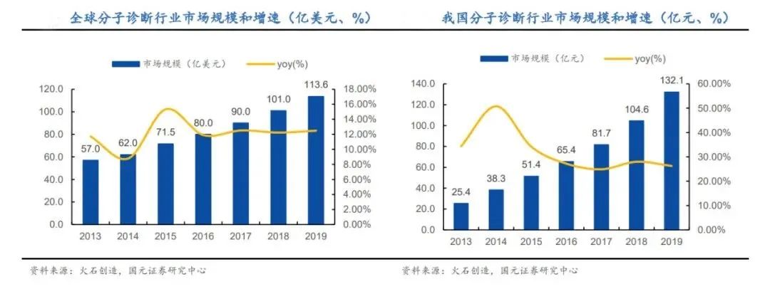 国内分子诊断市场规模从2013年的25.4亿元增长至2019年的132.1亿元,年复合增长率达到31.63%,增速约为全球增速的2.6倍。据有关机构预测到2024年分子诊断行业市场规模将达到330亿元,预计到2030年,分子诊断将超越免疫诊断成为IVD行业最大的市场。 全球市场规模也呈现稳步增长的态势,有数据显示,2013-2019 年全球分子诊断市场规模由57亿美元增长至113.6亿美元,年复合增长率为12.18%。BCC Research报告预计,全球分子诊断市场将从2021年的176亿美元达到2026 年的426亿美元,复合年增长率为19.3%。 声明:1、凡本网注明“来源:小桔灯网”的所有作品,均为本网合法拥有版权或有权使用的作品,转载需联系授权。2、凡本网注明“来源:XXX(非小桔灯网)”的作品,均转载自其它媒体,转载目的在于传递更多信息,并不代表本网赞同其观点和对其真实性负责。其版权归原作者所有,如有侵权请联系删除。 3、所有再转载者需自行获得原作者授权并注明来源。 最新评论相关分类图文热点 最新文章