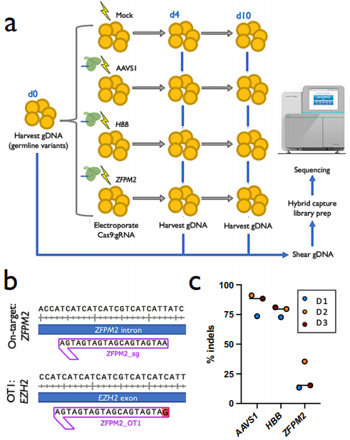 CRISPR系统由一个CRISPR/Cas蛋白与一个向导RNA(gRNA)组成,为了确保用于基因组编辑的CRISPR系统的临床安全,插入和缺失(INDEL)应仅发生在预期的基因组位点,而不会通过非同源末端连接(NHEJ)或同源定向修复(HDR)途径产生脱靶效应。低保真度Cas酶或当gRNA导向与目标序列类似的序列时,可能会发生非预期的基因组编辑,导至可能具有致癌或其他有害后果的非目标突变。检测基因组编辑方法的遗传毒性仍然是安全临床实施的基础。 基因组编辑/基因治疗在临床上的长期安全性的重要性最近得到了说明,在两个镰状细胞疾病基因治疗试验(NCT02140554和NCT04293185)中,两名患者因细胞毒化疗或慢病毒载体的插入突变而发展为髓系恶性肿瘤后导至临床试验暂停。由于这些安全性问题,在本研究中,研究团队试图确定Cas9编辑和/或体外扩增过程中是否引入了致癌变体。理想的方法必须进行超深测序,因为变异等位基因频率(VAF)低于1%的突变仍然无法被大多数全基因组脱靶检测技术检测到。能够检测SNV以及INDEL、扩增和多核苷酸变异(MNV)的超深测序工作流程有可能显著提高检测全谱致癌脱靶编辑活性的灵敏度,从1%到<0.1%VAF,这对于识别可能引发致病性克隆扩增的低频变异是必要的。 近日,一组来自美国顶尖学府的研究团队在杂志Nature Communications上发表了一篇题为“Ultra-deep sequencing validates safety of CRISPR/Cas9 genome editing in human hematopoietic stem and progenitor cells”的文章,在这篇文章中,研究团队开发了一个NGS工作流程,允许在最重要的基因组区域识别低频事件,以评估高风险遗传毒性。结果没有发现任何证据表明,在多个原代造血干细胞和祖细胞(HSPC)供体中,在三个单独的基因组位点进行Cas9体外基因组编辑会引入或富集致癌突变。当靶向AAVS1时,全外显子测序(WES)和全基因组测序(WGS)同样证实了这些发现。因此,研究团队定义了一种根据现有临床肿瘤学NGS诊断方法改编的方法,可用于在临床转化前评估当前和下一代基因组编辑工具、体外培养方案和细胞产品的安全性。 图片来源:Nature Communications 主要内容 实现了肿瘤抑制基因和癌基因的高覆盖率 为了对抑癌基因和肿瘤基因进行超深测序,研究团队使用hybrid-capture NGS assay深度检测523个癌症相关基因(跨越1.94MB DNA)外显子的DNA变异。这523个基因包括最常见癌症类型关键指南中的已知癌基因,以及许多在癌症(从非小细胞肺癌到胰腺癌)中常见突变的复发基因。 来自三个单独的健康供体的HSPC经受四种条件:Mock电穿以及三种不同的Cas9处理,其靶向位点为AAVS1、HBB或ZFPM2。文献中广泛记录了AAVS1和HBB处的Cas9活性,选择这些位点是因为它们分别具有相对较高和较低的靶外活性。为了确保每个gRNA具有高水平的靶向活性,对预测切割位点周围的基因组区域进行了靶向PCR扩增,然后进行桑格测序,并通过TIDE分析INDEL。在所有三个AAVS1和HBB gRNA供体中观察到高频率的靶向INDEL,但ZFPM2 gRNA诱导的INDEL较少,这是由于其预测的高脱靶活性。 初始实验的原始测序数据产生了所有样本的平均MEC>3550,分别对应于0.205%和95%的最小检测限(LoD)和灵敏度,且技术重复之间有高度一致性。 试验设计和靶向活性的确认。图片来源:Nature Communications 过滤非致病性胚系突变后,发现的变体很少 为了深入了解队列中确定的变体的特征,绘制了第0、4和10天Mock样本的VAF。当剔除同义变体以及之前报告在综合种系数据库中出现>10次的变体时,只剩下少数变体(每个条件下1490.1个可重复变体的平均值为3.9个变体)。 为了确定用Cas9编辑是否在肿瘤抑制基因或癌基因中引入突变,研究团队随后绘制了所有三个供体在第4天和第10天所有Cas9治疗组的VAF x MEC。接下来通过消除所有同义突变和/或胚系变体数据库中先前报告的突变剔除非致病性变体。与Mock样本相比,Cas9处理组具有更少的剩余变体(每个条件下的1487.9个可重复变体的平均剩余3.3个变体)。因为在Mock样品中发现的任何变体都不是被Cas9引入的,将其移除用于下游分析。在18个Cas9处理组中,过滤后仅剩下6个变体,其中4个是第4天和第10天ZFPM2处理中供体2和3中预期的EZH2突变。另外两个变体均为供体2和供体3中d10 ZFPM2处理中发现的SNV,其VAF<0.0015,接近检测极限。 TSO500测序数据总结。图片来源:Nature Communications Cas9 gRNA spacer纯合SNP消除EZH2脱靶活性 在供体2和供体3中,预期的EZH2脱靶位点在所有三个重复的d4和d10时间点显示出最高的VAF,置信度高(3893x覆盖率),平均脱靶活性为19.3%(图a)。尽管ZFPM2具有高度的脱靶活性,但在供体1中的EZH2处没有通过NGS或TIDE检测到脱靶活性(图b)。在研究供体1的该位点的桑格轨迹后,在spacer序列的第6位发现了纯合SNP。由于高保真Cas9的特异性,该纯合子SNP可能消除了该位点的所有活性。 在Cas9处理中鉴定的变体。图片来源:Nature Communications 全外显子测序证实了体外培养和基因组编辑中不存在脱靶活性 接下来将脱靶活性的搜索扩展到整个外显子组。外显子组分析在AAVS1处理中鉴定了137种体细胞变体,在Mock条件下鉴定了92种变体(图b)。 剔除了Mock处理中发现的>0.01 VAF的变体,留下30个体细胞突变供进一步分析(图c)。Cas9核酸酶活性通常在与spacer序列高度同源的位点周围引入indels,但过滤后的大多数剩余变体(30个中的17个)是SNV,并且在变体的上游或下游20bp内,发现30个突变中没有一个与spacer +PAM序列匹配>10bp。因此,无论是靶向抑癌基因/癌