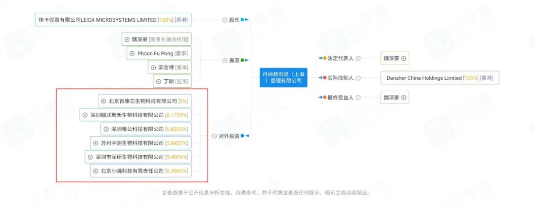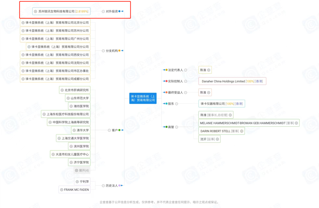 而在徕卡显微系统(上海)贸易有限公司下面也有一家IVD领域的投资公司,苏州锐讯生物科技有限公司。